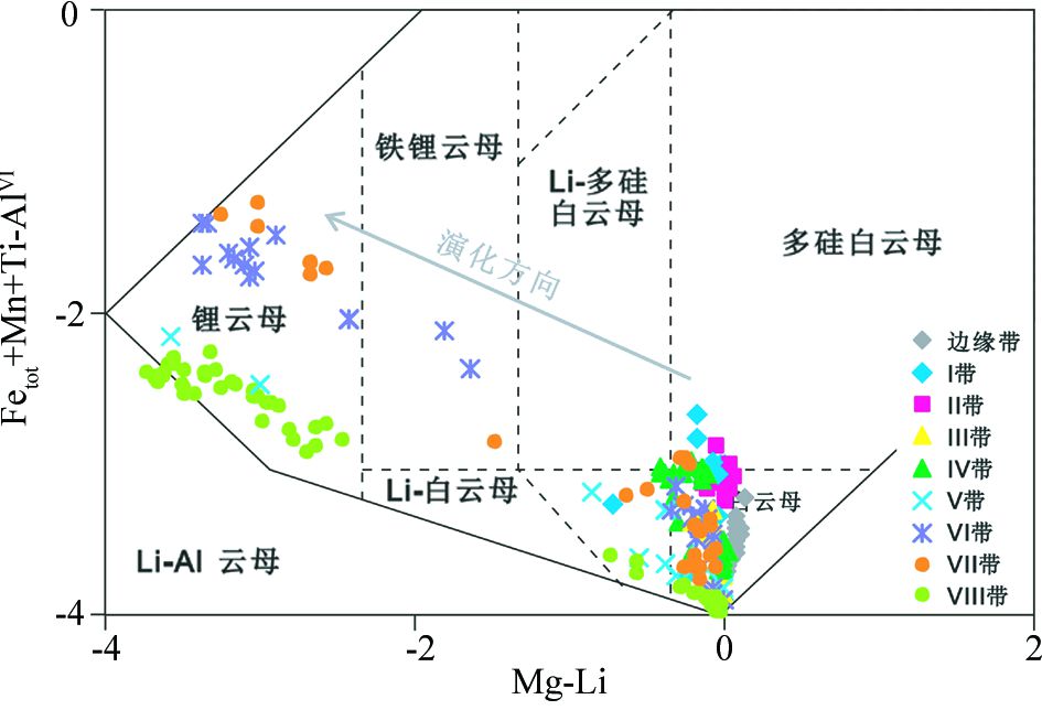 图 6 可可托海3号脉云母的Mg-Li vs. Fe+Mn+Ti-AlⅥ图解(底图据Tischendorf et al., 1997) Fig. 6 Plot of Mg-Li vs. Fe+Mn+Ti-AlⅥ for micas from the Koktokay No.3 pegmatite(after Tischendorf et al., 1997) |