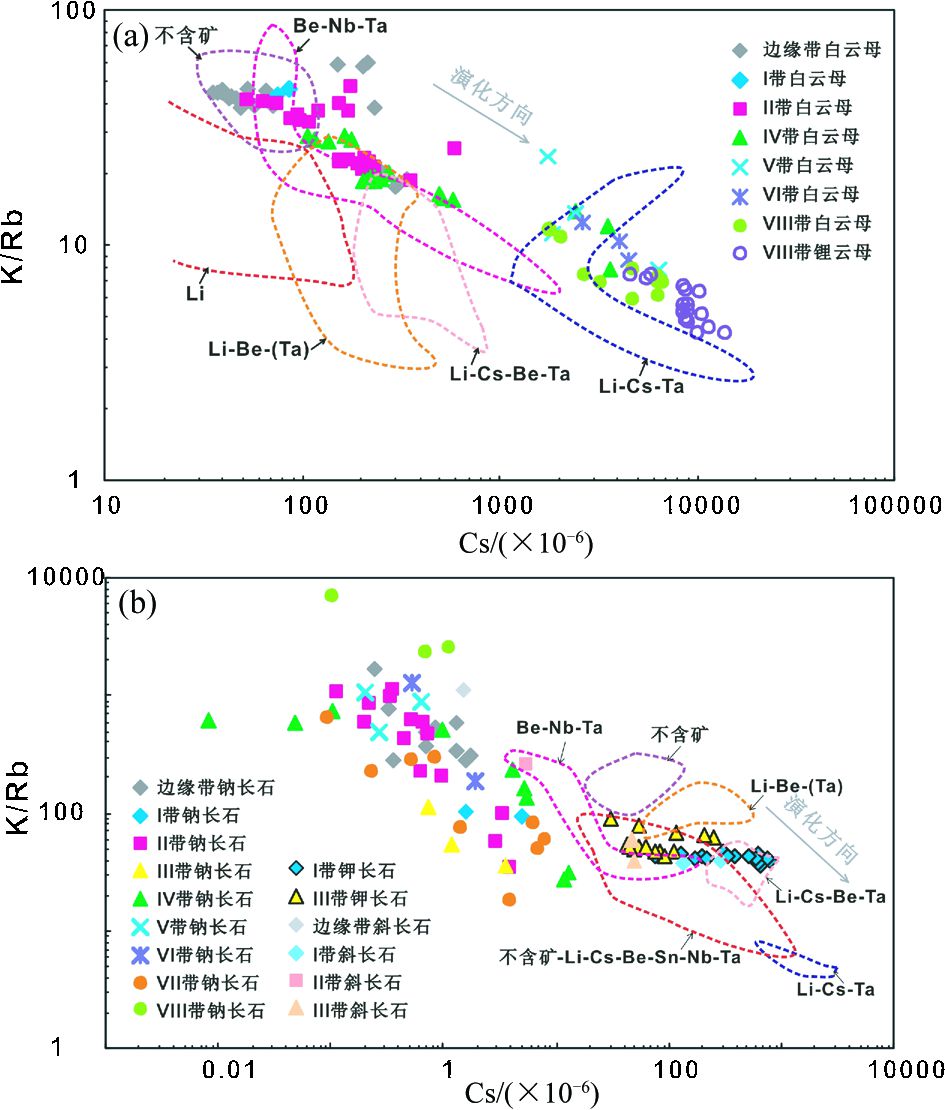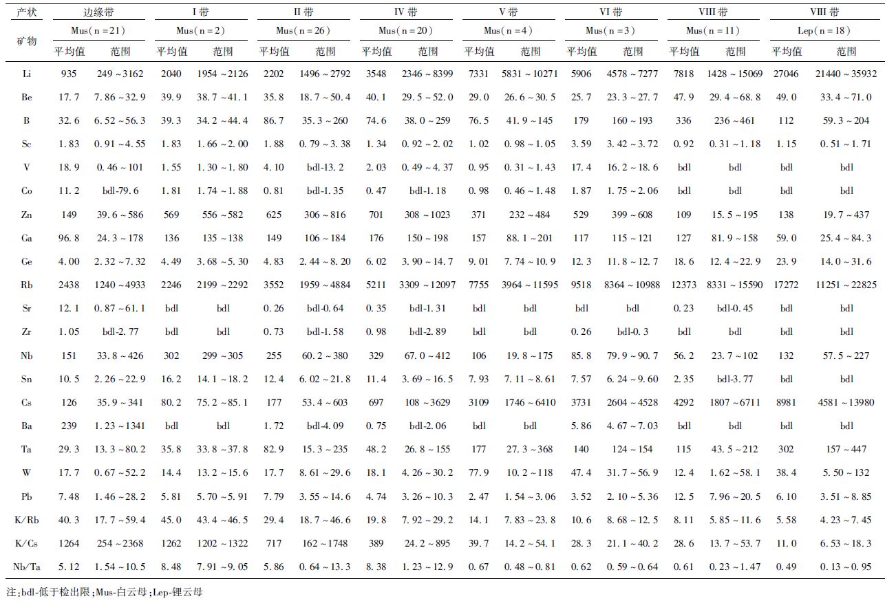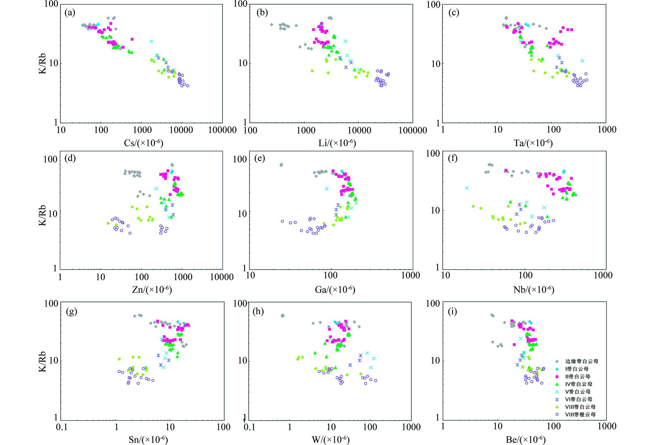 通过LA-ICP-MS分析测试获得白云母和锂云母的微量成分(表 4)。REE、Y、Sb、Ni、Cu、Mo、Ag、Cd、Bi、As、Se、Th、U均低于检出限。本区云母Li含量249×10-6~35932×10-6,Rb含量1240×10-6~22825×10-6,Cs含量35.9×10-6~13980×10-6,边缘带白云母Li含量较低,由Ⅰ带至Ⅷ带云母Li、Rb和Cs含量升高,Ⅷ带锂云母的Li、Rb和Cs含量高于该带白云母的(图 7a, b和表 4)。云母Zn含量15.5×10-6~1023×10-6,边缘带-Ⅳ带白云母Zn含量升高,Ⅳ带>Ⅴ带<Ⅵ带>Ⅷ带(图 7d和表 4)。云母Ga含量24.3×10-6~201×10-6,呈现弱的由边缘带至Ⅳ带升高,由Ⅴ带至Ⅷ带降低的趋势(图 7e和表 4),边缘带白云母Ga含量较低,Ⅷ带锂云母Ga含量最低,且低于Ⅷ带白云母的Ga含量,表明白云母相对于锂云母更富集Ga。云母B含量6.52×10-6~461×10-6,边缘带-Ⅷ带白云母B含量升高,Ⅷ带锂云母的B含量低于Ⅷ带白云母的,表明白云母相对于锂云母更富集B。云母的Nb含量19.8×10-6~412×10-6,外部带白云母Nb含量(33.8×10-6~412×10-6)高于内部带白云母Nb含量(19.8×10-6~175×10-6),Ⅴ带-Ⅷ带白云母Nb含量降低,Ⅷ带锂云母Nb含量高于Ⅷ带白云母Nb含量,表明锂云母相对于白云母富集Nb(图 7f和表 4)。云母Ta含量13.3×10-6~447×10-6,外部带白云母Ta含量(13.3×10-6~235×10-6)低于内部带云母Ta含量(27.3×10-6~368×10-6),Ⅷ带锂云母Ta含量高于Ⅷ带白云母Ta含量,表明锂云母相对于白云母富集Ta(图 7c和表 4)。云母Be含量7.86×10-6~71.0×10-6,各结构带的变化不大,边缘带、Ⅴ带和Ⅵ带略低,呈现弱的外部带>Ⅴ带和Ⅵ带<Ⅷ带的趋势(图 7i和表 4)。云母Sn含量2.26×10-6~22.9×10-6,外部带白云母Sn含量略高于内部带白云母的Sn含量,Ⅴ带-Ⅷ带Sn含量降低,Ⅷ带锂云母Sn含量低于检出限(图 7g和表 4)。云母W含量0.67×10-6~119×10-6,外部带白云母W含量低于内部带白云母W含量,Ⅴ带-Ⅷ白云母W含量降低,Ⅷ带锂云母W含量高于Ⅷ带白云母的,表明锂云母相对于白云母更富集W(图 7h和表 4)。云母Ge含量2.32×10-6~31.6×10-6,外部带白云母Ge含量略低于内部带白云母Ge含量,Ⅷ带云母Ge含量稍高。云母Pb含量1.46×10-6~31.6×10-6,Ⅷ带云母Pb含量稍高。云母Sc含量(0.31×10-6~4.55×10-6)较低,各结构带的变化不大,Ⅵ带略高。云母Co含量(0.46×10-6~79.6×10-6)较低,各结构带的变化不大,边缘带略高,Ⅷ带云母低于检出限。云母Ⅴ含量(0.46×10-6~101×10-6)较低,边缘带和Ⅵ带略高,Ⅷ带云母低于检出限。云母Sr、Ba、Zr含量多低于检出限,其中边缘带的Sr和Ba含量稍高,外部带白云母Zr含量略高。由上,锂云母相对于白云母更富集W、Nb和Ta,贫Ga、Sn和B。
