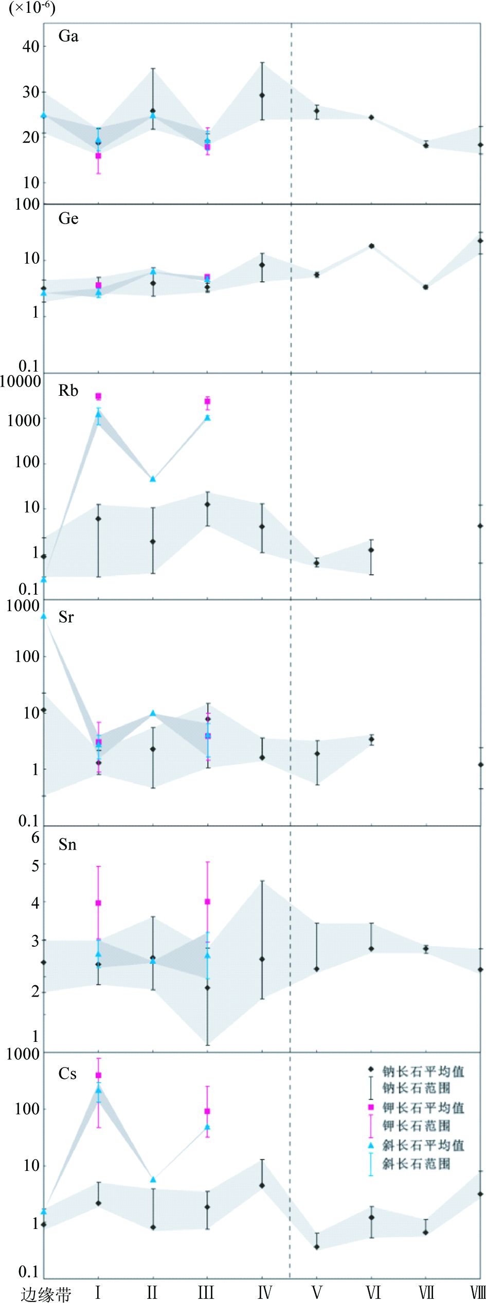 通过LA-ICP-MS分析测试获得3号脉边缘带和Ⅰ带-Ⅷ带钠长石的微量元素成分(表 5),其中Li含量0.18×10-6~17.3×10-6,Be含量0.59×10-6~14.4×10-6,Rb含量0.32×10-6~23.6×10-6,Ⅶ带钠长石Rb含量低于检出限,Sr含量0.34×10-6~22.4×10-6,部分Ⅳ带和Ⅶ带钠长石Sr含量低于检出限,Sc含量0.54×10-6~2.64×10-6,Ga含量16.0×10-6~36.5×10-6,Ge含量1.80×10-6~31.3×10-6,Pb含量0.91×10-6~33.9×10-6,B含量3.94×10-6~27.0×10-6。外部带钠长石的Li、Ga、Ge、Pb含量变化趋势为边缘带>Ⅰ带<Ⅱ带>Ⅲ带<Ⅳ带;Rb含量变化趋势为边缘带<Ⅰ带>Ⅱ带<Ⅲ带>Ⅳ带;Sr含量变化趋势为边缘带>Ⅰ带<Ⅱ带<Ⅲ带>Ⅳ带;Cs含量变化趋势为边缘带<Ⅰ带>Ⅱ带<Ⅲ带<Ⅳ带。内部带钠长石的Li、Be、Pb含量变化趋势为Ⅴ带>Ⅵ带<Ⅶ带>Ⅷ带,呈振荡变化;而Ga、Ge、Rb、Sr和Cs含量变化趋势为Ⅴ带<Ⅵ带>Ⅶ带<Ⅷ带,呈振荡变化;Sn含量变化趋势为Ⅴ带<Ⅵ带>Ⅶ带>Ⅷ带(图 8和表 5)。Zn含量0.65×10-6~733×10-6,边缘带较高,Ⅳ-Ⅷ带多低于检出限。Sn含量0.18×10-6~4.55×10-6,内部带低于或在检出限附近。Cr、Cu、Sb、Cs和Ba均低于或在检出限附近(表 5)。边缘带-Ⅷ带钠长石K/Rb值范围为18.0~7074,Rb/Sr值范围为0.02~31.7。