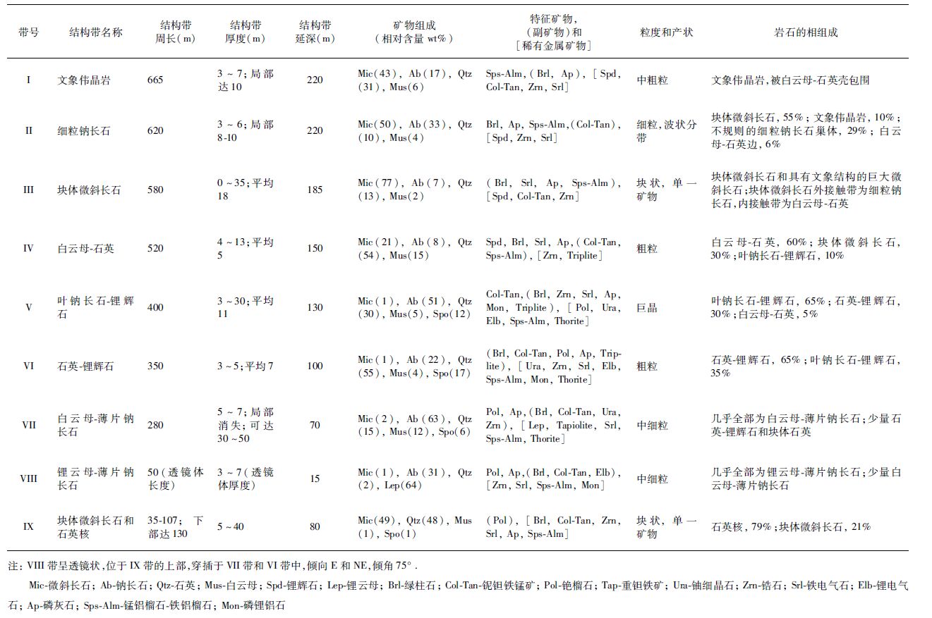 可可托海3号脉形似实心礼帽,由岩钟体和底部缓倾斜体两部分组成(图 3c)。岩钟体走向N335°,倾向北东,倾角40°~80°,沿走向长250m,宽150m,斜深250m(邹天人和李庆昌,2006)。岩钟体发育完美的内部分带结构,呈同心环状,由外向内可划分为9个结构带(图 3b, c),包括文象伟晶岩带(Ⅰ带)、细粒钠长石带(Ⅱ带)、块体微斜长石带(Ⅲ带)、白云母-石英带(Ⅳ带)、叶钠长石-锂辉石带(Ⅴ带)、石英-锂辉石带(Ⅵ带)、白云母-薄片钠长石带(Ⅶ带)、锂云母-薄片钠长石带(Ⅷ带)和块体微斜长石和石英核(Ⅸ带),具体矿物组成和产状规模列于表 1。尽管3号脉划分为9个内部结构带,但每个带由不同的岩相或蚀变岩相带组成(表 1)。外部带包括Ⅰ-Ⅳ带,内部带包括Ⅴ-Ⅷ带。另外,Ⅰ-Ⅱ带为Be矿化、Ⅲ-Ⅳ带为Be-Nb-Ta矿化、Ⅴ-Ⅵ带为Li-Be-Nb-Ta矿化、Ⅶ带为Nb-Ta矿化、Ⅷ带为Ta-Cs-Li矿化、Ⅸ带为Rb-Cs矿化。根据伟晶岩的分类方案(Černy and Ercit, 2005),可可托海3号脉属稀有金属类型中的锂辉石亚类型。