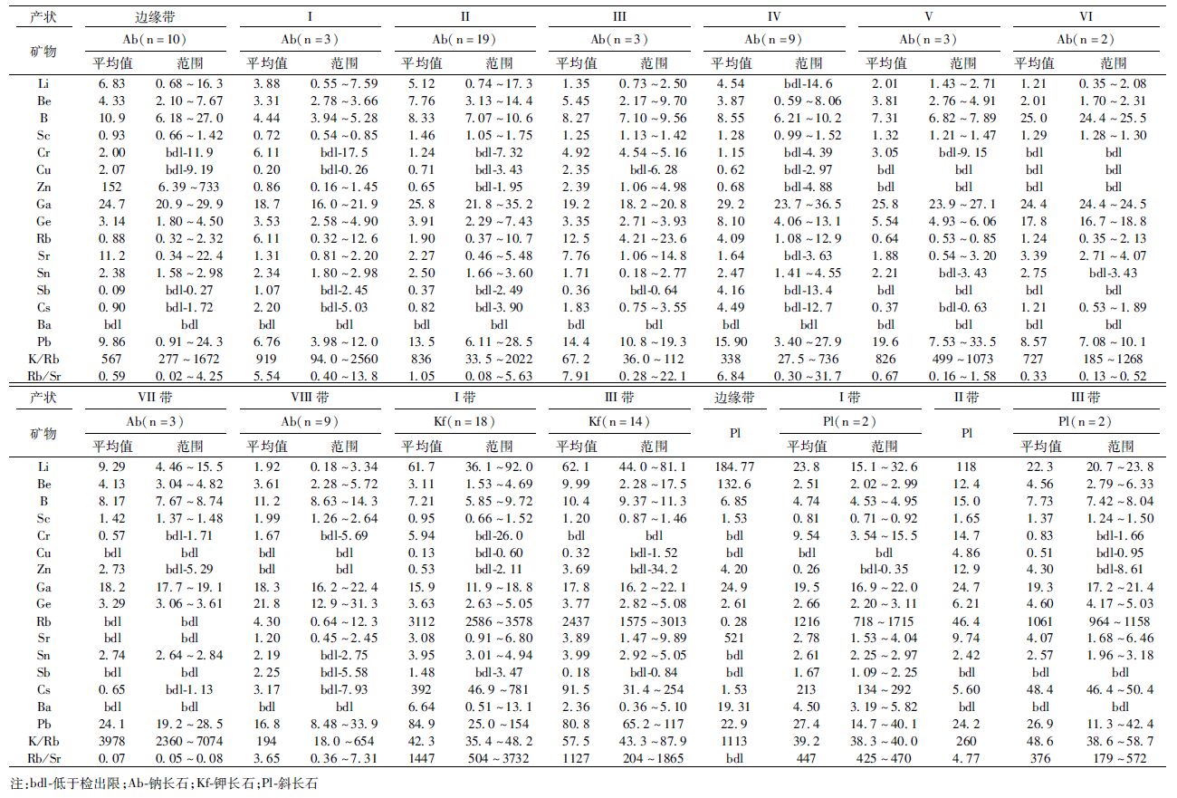 图 8 可可托海3号脉各结构带长石微量元素含量变化 Fig. 8 The trace-element composition of the feldspars from Ⅰ-Ⅷ zones of the Koktokay No.3 pegmatite |