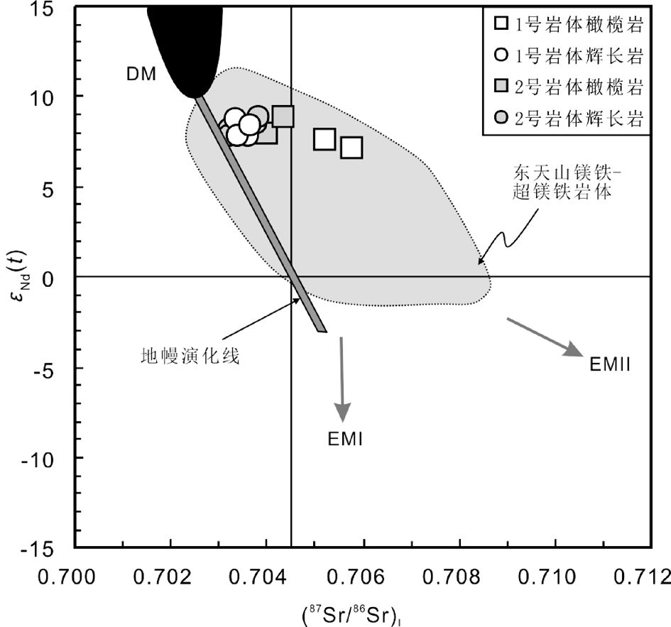图 7 大草滩一、二号岩体Sr-Nd同位素图解 东天山镁铁-超镁铁岩体据Qin et al. (2011) ;DM和EM据Zindler and Hart (1986) Fig. 7 Whole-rock Sr-Nd isotopic compositions of the rocks from the No.1 and No.2 intrusions in the Dacaotan area Reference area for East Tianshan mafic-ultramafic intrusions is after Qin et al. (2011) . DM (depleted mantle) and EM (enriched mantle) data are from Zindler and Hart (1986) |