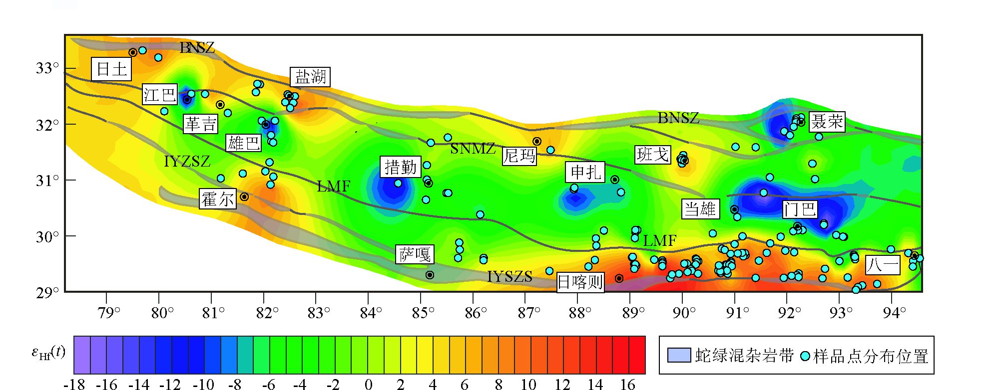 在数据处理过程中,去掉了数据中异常高或异常低的值(如措勤地区的一件样品存在-20.4~-2.7的锆石εHf(t)值,本文在数据处理时去掉了最低值-20.4),这是因为Surfer 10 成图过程中,如果一个地区存在很小或很大的锆石εHf(t)值,将严重影响到邻近没有数据点控制的区域,进而影响到最终判断。最后对Surfer 10生成的图件利用Illustrator CS5美化修饰,并添加相关地质内容,可从宏观上揭示拉萨地体地壳性质的空间展布特征。