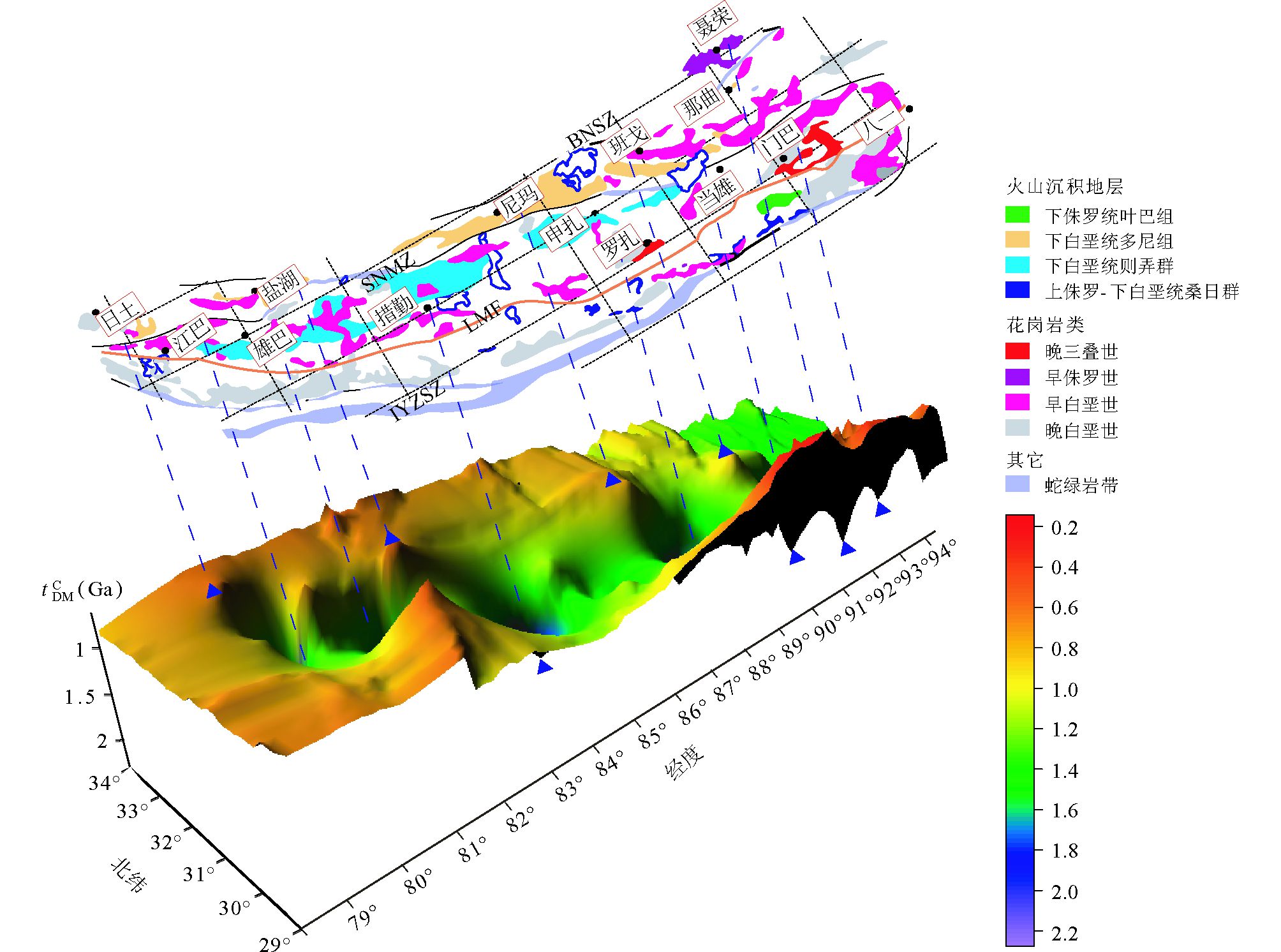 BNSZ:班公湖-怒江缝合带;SNMZ:狮泉河-纳木错蛇绿混杂岩带;LMF:洛巴堆-米拉山断裂;IYZSZ:印度河-雅鲁藏布缝合带.图中构造线位置据 |