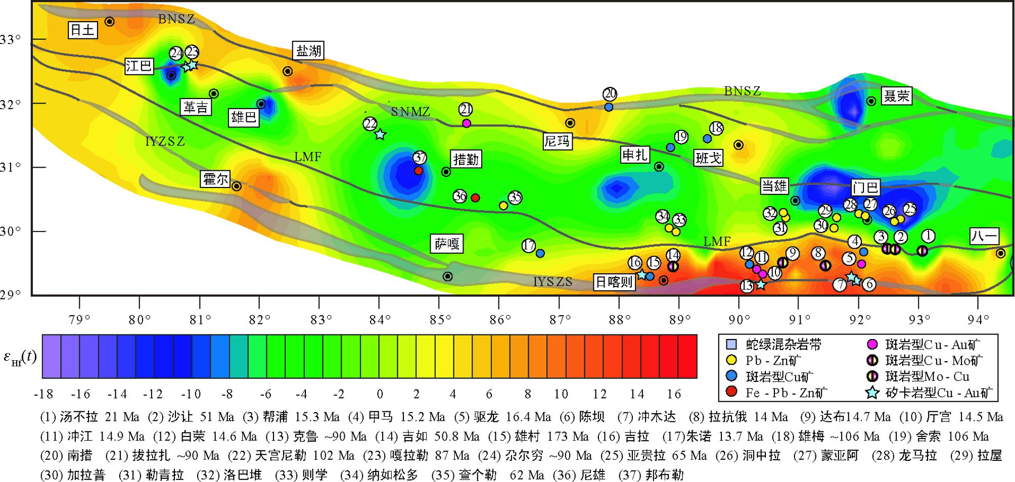 图 3 强调了不同类型矿床位置的拉萨地体中生代-早新生代(210~40Ma)酸性岩浆岩锆石Hf同位素等值线图 Fig. 3 Contour map of zircon Hf isotope of silicic magmatic rocks aged from Mesozoic to Early Cenozoic (210~40Ma) in the Lhasa Terrane with special emphasis to the locations of different types of deposits |