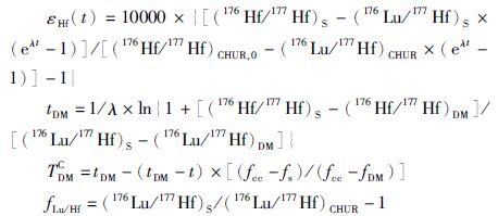 λ=1.867×10-11year-1 (Söderlund et al., 2004); (176Lu/177Hf)S和(176Hf/177Hf)S为样品的标准化数据; (176Lu/177Hf)CHUR=0.0332; (176Hf/177Hf)CHUR, 0=0.282772 (Blichert-Toft and Albarède, 1997); (176Lu/177Hf)DM=0.0384; (176Hf/177Hf)DM=0.28325 (Griffin et al., 2000); (176Lu/177Hf)mean crust=0.015; fcc=[(176Lu/177Hf)mean crust/(176Lu/177Hf)CHUR]-1; fs=fLu/Hf; fDM=[(176Lu/177Hf)DM/(176Lu/177Hf)CHUR]-1; t=锆石的结晶年龄