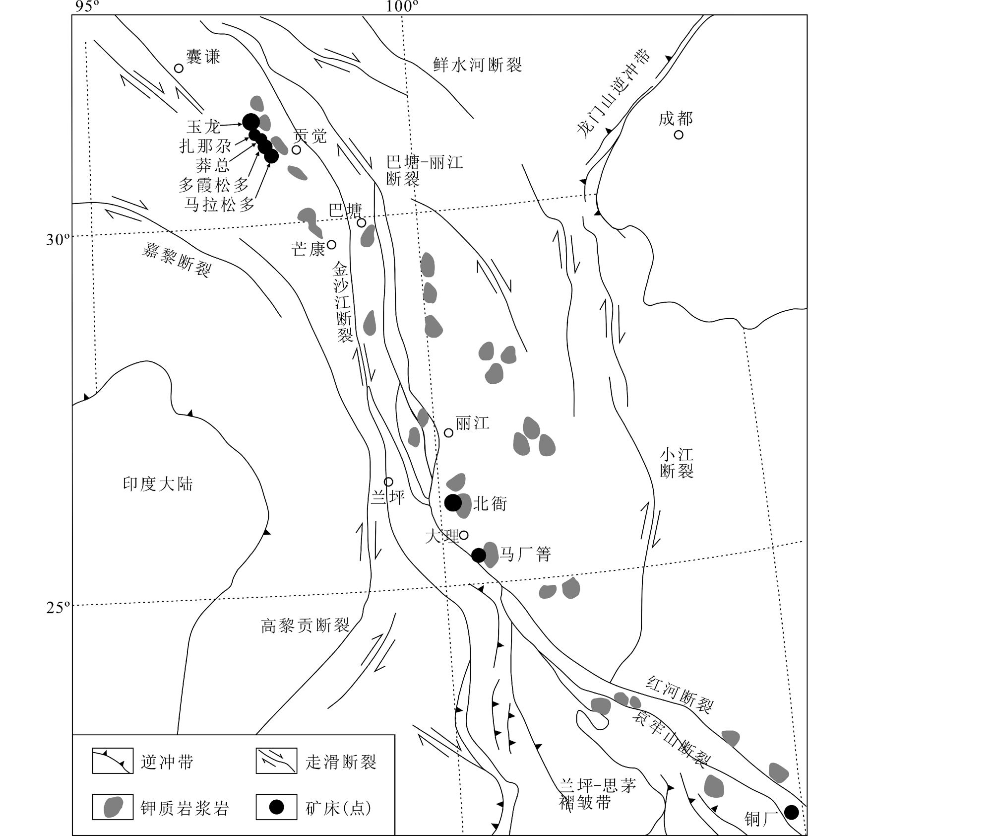 图 1 金沙江-哀牢山钾质岩浆岩带地质略图以及典型矿床位置(据Wang et al., 2001;侯增谦等,2004修改) Fig. 1 Geological sketch map of the Jinshajing-Ailaoshan potassic magmatic rocks belt and distribution of the typical deposits (modified after Wang et al., 2001; Hou et al., 2004) |