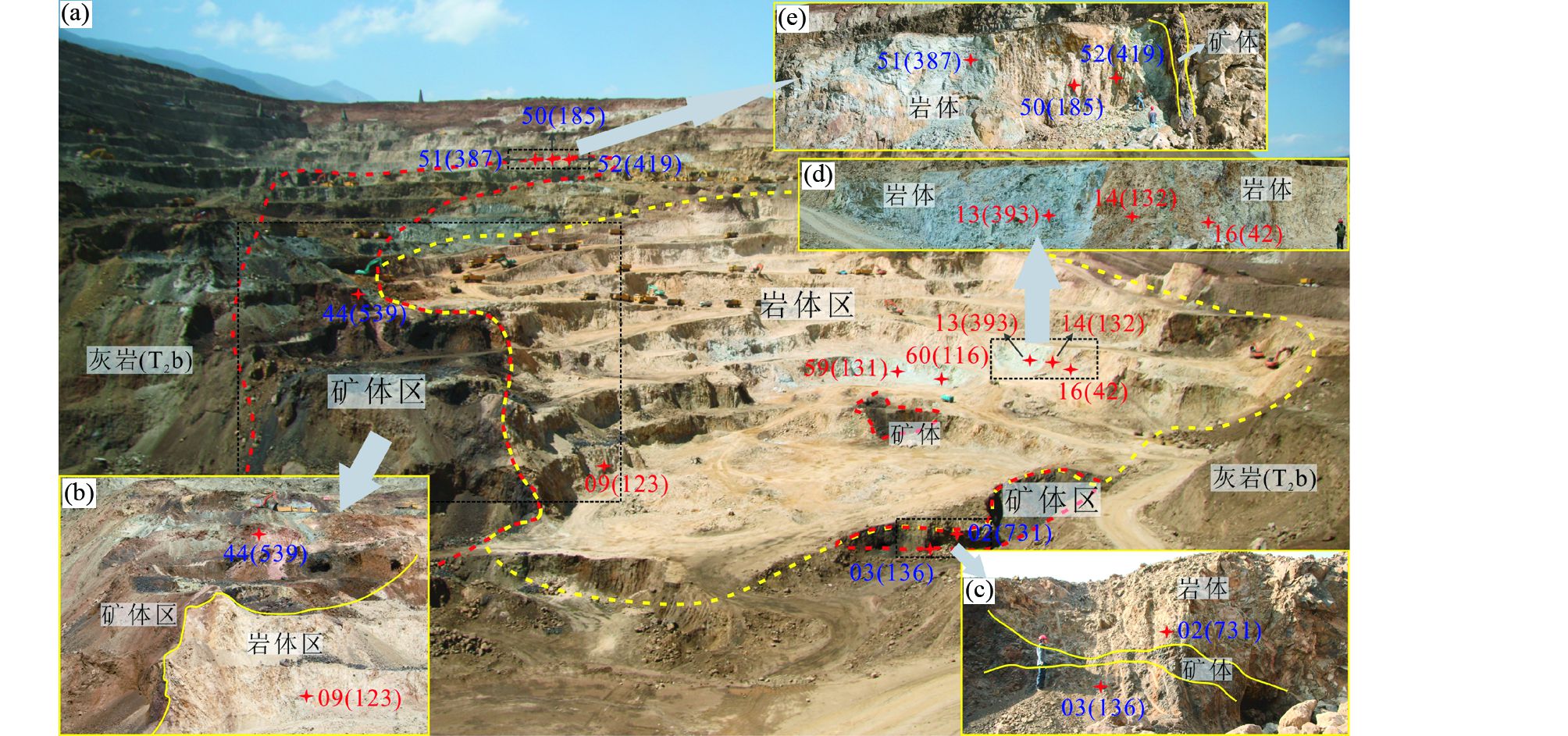 图 2 北衙矿区万硐山矿段露天采场及样品采集位置图 星号表示采样位置;如“09(123) ”指09号样品和Ce(Ⅳ)/Ce(Ⅲ)平均值为123 Fig. 2 The open pit of Wandongshan in Beiya gold deposit and the locations of the samples Asterisks show the locations of the samples; “09(123) ” means sample No.09 and average zircon Ce(Ⅳ)/Ce(Ⅲ)) is 123 |