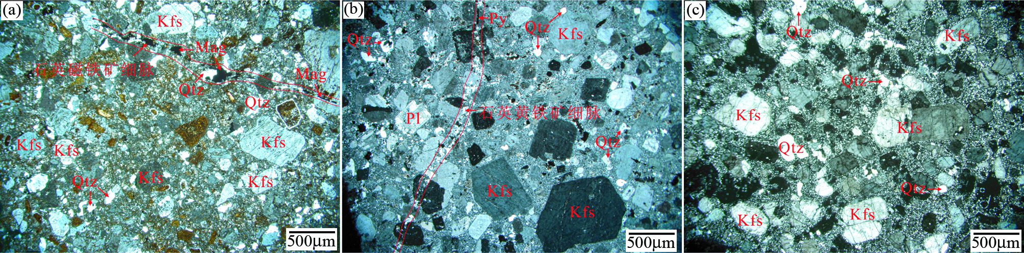 图 3 北衙矿区典型岩体显微照片 (a)-02号样品;(b)-13号样品;(c)-09号样品.Kfs-钾长石;Pl-斜长石;Qtz-石英;Mag-磁铁矿 Fig. 3 Microphotographs of typical intrusions in the Beiya deposit (a)-sample No.02; (b)-sample No.13; (c)-sample No.09. Kfs-K-feldspar; Pl-plagioclase; Qtz-quartz; Mag-magnetite |
