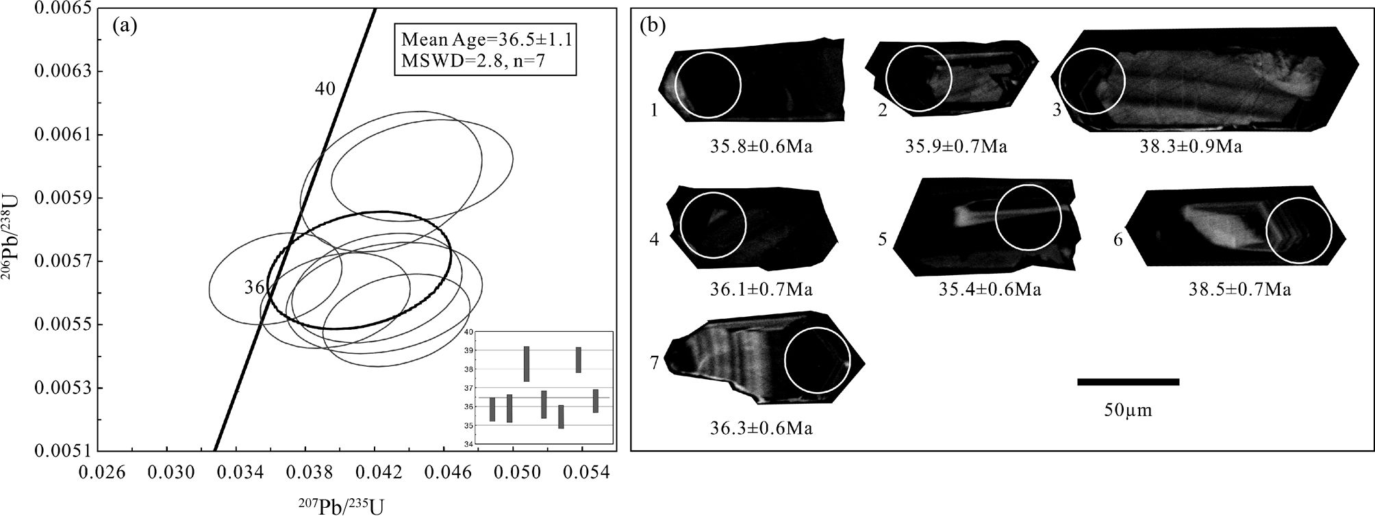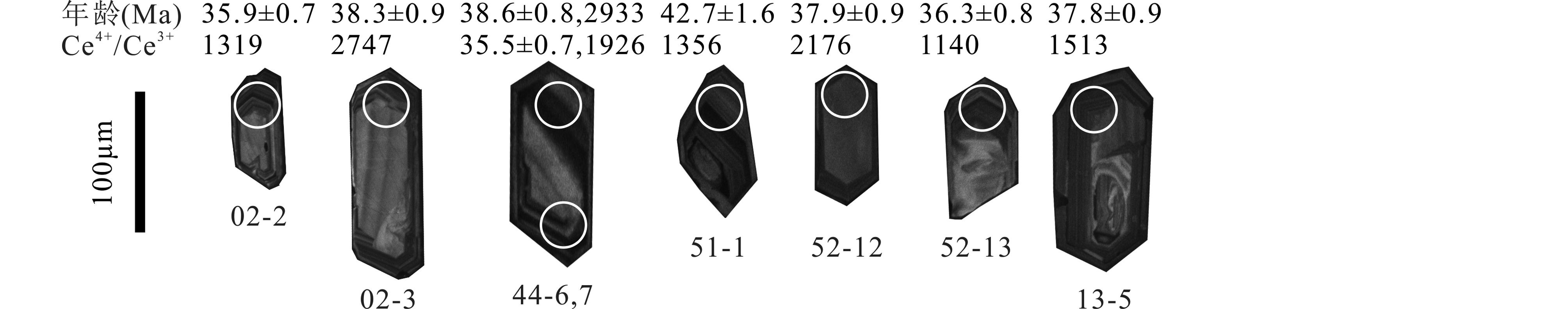 北衙矿区万硐山矿段典型斑岩锆石LA-ICP-MS U-Pb年龄协和图见图 4a,样品02的七个分析点的206Pb/238U加权平均年龄为36.5±1.1Ma,MSWD为2.8。岩体中锆石Ce(Ⅳ)/Ce(Ⅲ)比值计算的表达式为(Ballard et al., 2002),由此公式可知,需要四个参数:锆石中Ce含量、熔体中Ce含量(用全岩Ce代替)、Ce(Ⅳ)和Ce(Ⅲ)的分配系数,带入即可求得Ce(Ⅳ)/Ce(Ⅲ)比值。详细计算方法过程在此不再赘述,详见Ballard et al. (2002) 。单颗粒锆石Ce(Ⅳ)/Ce(Ⅲ)比值计算结果分析见图 6,分析计算了北衙矿区十二件岩石样品共计101个锆石颗粒(点),其中岩体外带斑岩和岩体内带斑岩分别为51和50个锆石颗粒(点);部分样品单颗粒锆石Ce(Ⅳ)/Ce(Ⅲ)比值变化范围较大,Ce(Ⅳ)/Ce(Ⅲ)异常高值的锆石颗粒阴极发光照见图 7,这些Ce(Ⅳ)/Ce(Ⅲ)异常高值的锆石与其它锆石颗粒特征也基本一致。如表 1所示,北衙矿区6件岩体外带与6件岩体内带的斑岩Ce(Ⅳ)/Ce(Ⅲ)平均值范围分别为136~731、42~393,均值分别为400、156。同时总结了前人关于金沙江-哀牢山钾质岩浆岩带北段玉龙斑岩铜矿带、中段马厂箐铜钼矿床和南段金平铜厂铜钼矿床的锆石Ce(Ⅳ)/ Ce(Ⅲ)比值及锆石U-Pb年龄,玉龙斑岩铜矿带含矿斑岩和无矿斑岩Ce(Ⅳ)/Ce(Ⅲ)平均值范围分别为201~334、93~112;马厂箐含矿与无矿斑岩Ce(Ⅳ)/Ce(Ⅲ)平均值分别为264、102,金平铜厂分别为265、61(表 3)。