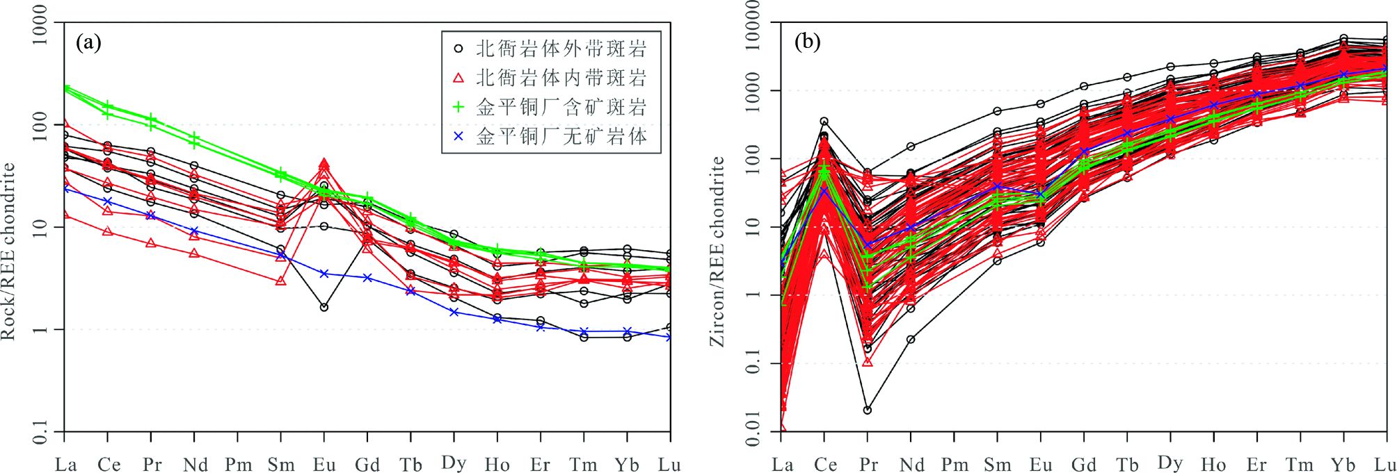 图 5 全岩(a)和锆石(b) 球粒陨石标准化稀土元素配分曲线(标准化值据Boynton, 1984) Fig. 5 Chondrite-normalized REE patterns of whole-rocks (a) and zircons (b) (normalization values after Boynton, 1984) |