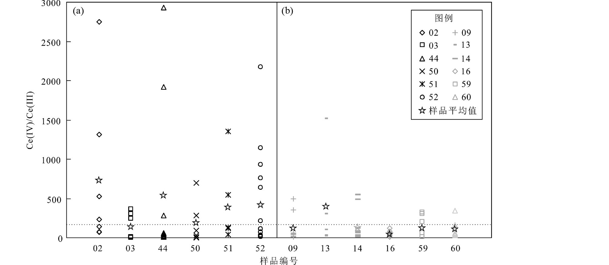 图 6 北衙矿区岩石样品中单颗粒锆石Ce(Ⅳ)/Ce(Ⅲ)比值和样品平均值分布 (a)-岩体外带斑岩;(b)-岩体内带斑岩 Fig. 6 Individual grain zircon and average zircon Ce(Ⅳ)/Ce(Ⅲ) ratios of intrusions in Beiya deposit (a)-porphyries of outer belt in intrusion; (b)-porphyries of inner belt in intrusion |