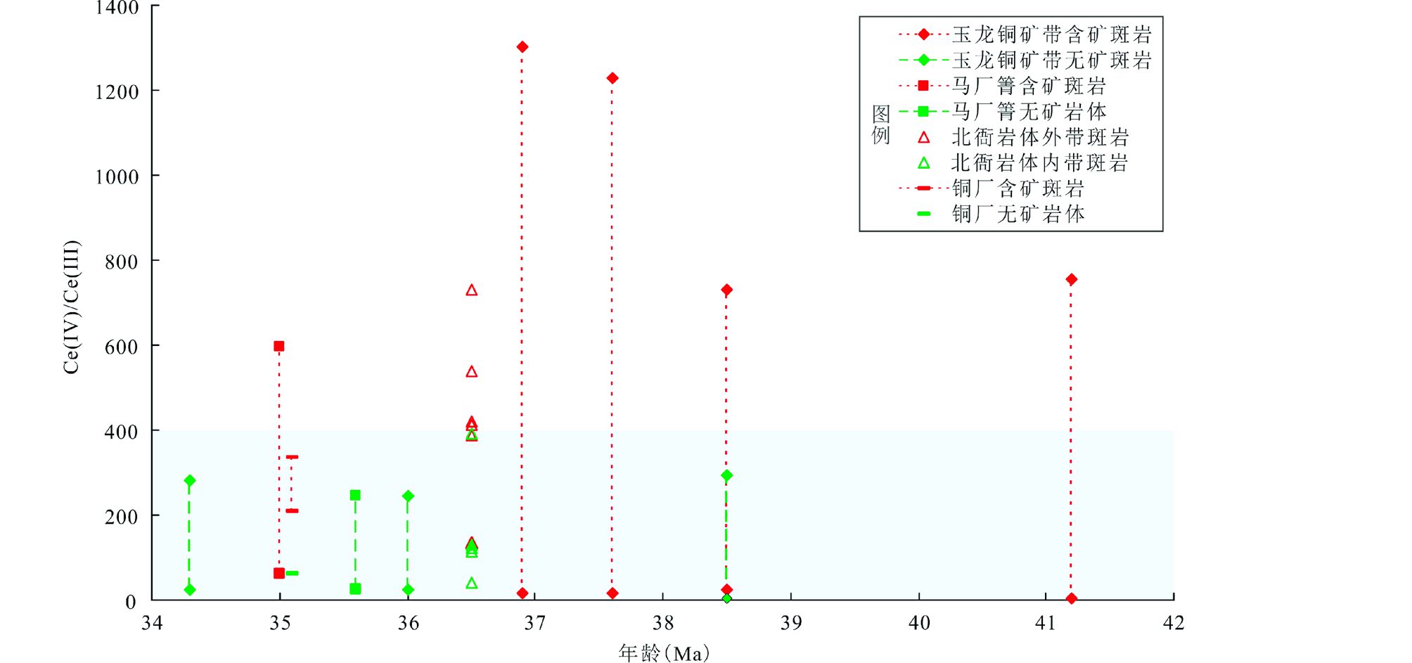 5 结论北衙矿区岩体外带和内带斑岩的锆石Ce(Ⅳ)/Ce(Ⅲ)平均值范围分别为136~731、42~393,岩体外带该比值明显较高,其总体趋势为岩体外带的相对氧化性要强于内带;对比了金沙江-哀牢山钾质岩浆岩带上其它典型矿床的锆石Ce(Ⅳ)/Ce(Ⅲ)比值特征,显示不同矿床之间Ce(Ⅳ)/Ce(Ⅲ)比值差异较大;表明岩体锆石Ce(Ⅳ)/Ce(Ⅲ)比值的高低不仅与岩体成矿能力相关,还可能受到岩体空间位置分布的影响,岩体锆石Ce(Ⅳ)/Ce(Ⅲ)比值高并不一定指示是成矿岩体,还需对锆石颗粒单点Ce(Ⅳ)/Ce(Ⅲ)比值分布特征进行统计分析;该比值可以作为单个矿床判断岩浆相对氧化状态和评价中酸性岩石岩浆-热液铜-金成矿能力的一种参考。