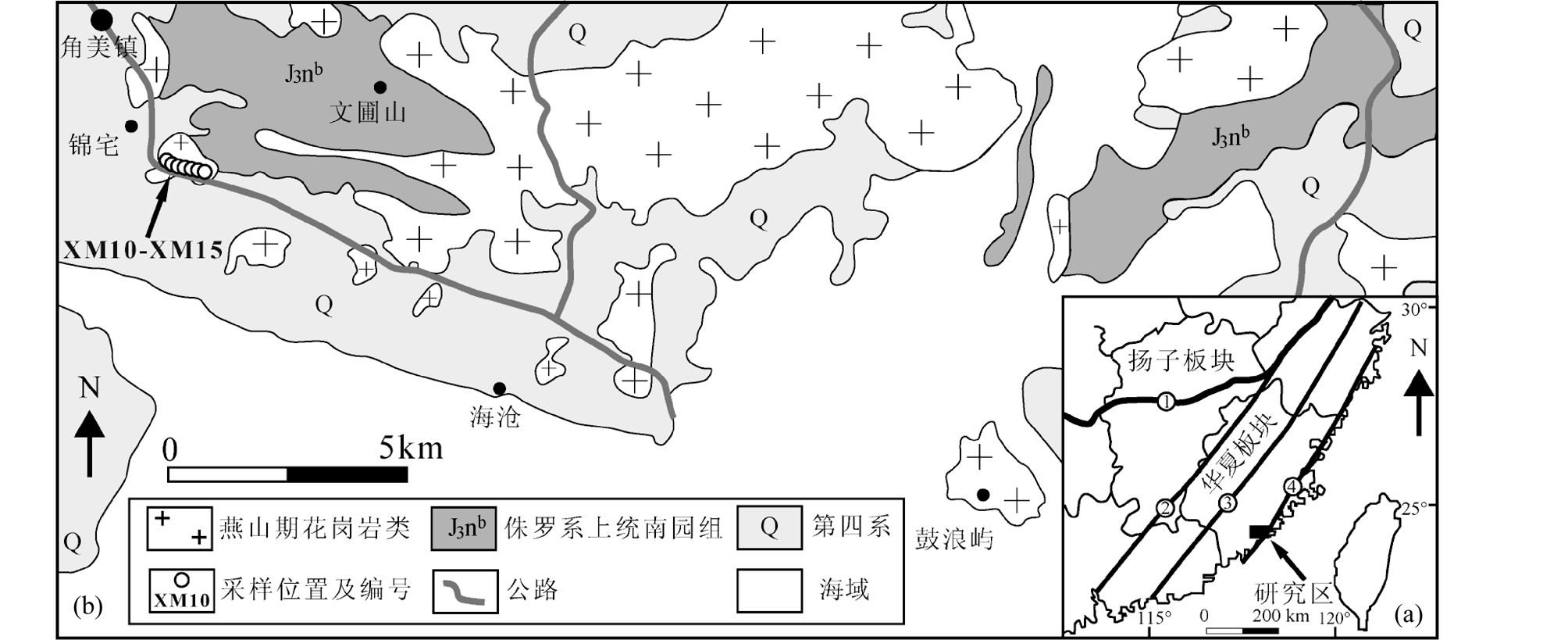 花岗岩类和少量与之有关的中基性岩石是大陆地壳的主要成分,它们通常分布在岛弧、活动大陆边缘和碰撞带等构造环境中,是参与陆壳生长的主要物质(Barbarin, 1990; Bonin et al., 1998;Jahn et al., 2000),对其开展研究是认识地壳的形成、演化及定量研究地球动力学过程的基本前提(Rudnick, 1995)。华南是我国花岗岩类出露面积最大的地区之一,其中华南东部中生代花岗岩的出露面积占整个华南花岗岩出露总面积的78.9%(孙涛, 2006),因此中生代的岩浆活动是最为强烈的时期。福建省的燕山期岩浆活动主要分布在闽东南和闽东北的沿海地区,一直以来被认为是揭示岩浆作用的性质与成因的重要地区,不断取得新的研究成果,例如,在研究沿海地区花岗岩的岩石成因中,强调了存在岩浆混合作用和大量幔源物质的贡献(邱检生等, 2008, 2012; 赵蛟龙等, 2012)。但是由于沿海地区花岗岩出露面积大,多数地区还缺少精确定年来约束花岗岩的形成时限和岩浆源区的性质。本文选择福建漳州角美地区的花岗闪长岩及其中包含的闪长质包体,通过锆石U-Pb年代学和Hf同位素分析,并结合岩石的元素和Sr-Nd同位素组成,试图为福建沿海地区燕山晚期岩浆混合作用提供新证据,进一步限定地幔组分对形成沿海地区大面积花岗岩的重要作用。