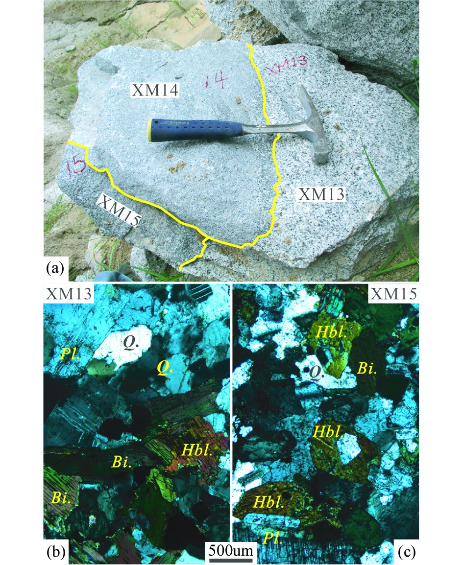 图 2 角美寄主花岗闪长岩和闪长质包体的野外露头(a)和显微镜下(b, c)照片(均为正交偏光) Hbl.-普通角闪石;Bi.-黑云母;Pl.-斜长石;Q.-石英 Fig. 2 Outcrop (a) and microscopic (b, c) photos of Jiaomei granite and dioritic enclaves |