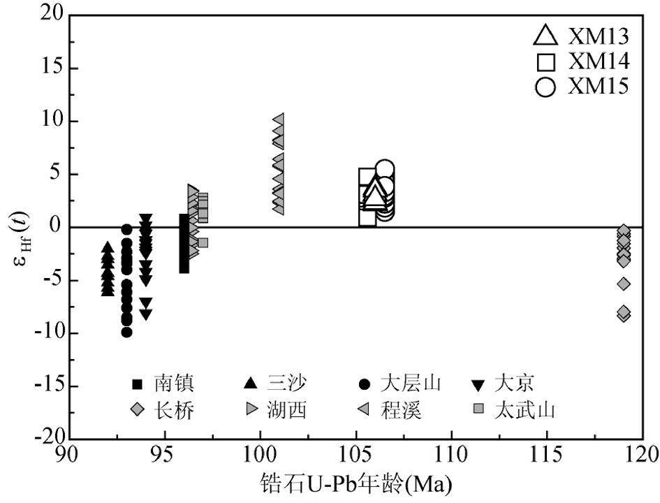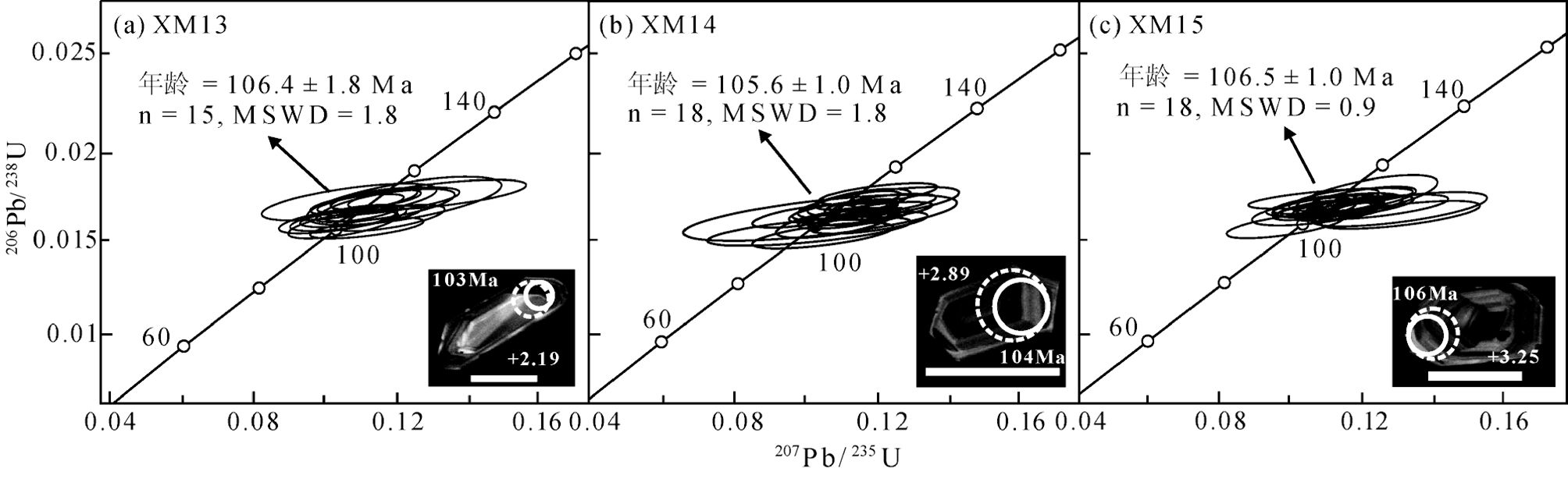 闪长质包体(XM14, XM15)的锆石呈自形短柱状,长100~150μm,CL图可见其清晰生长环带。XM14和XM15样品都有18个有效测点,U的含量分别为528×10-6~6832×10-6和892×10-6~2890×10-6,Th的含量分别为421×10-6~13897×10-6和507×10-6~1867×10-6,Th/U比值为0.38~2.04(Th/U>0.1),均为岩浆成因锆石。锆石206Pb/238U加权平均年龄分别为105.6±1.0Ma和106.5±1.0Ma(图 3b, c, 表 1)。