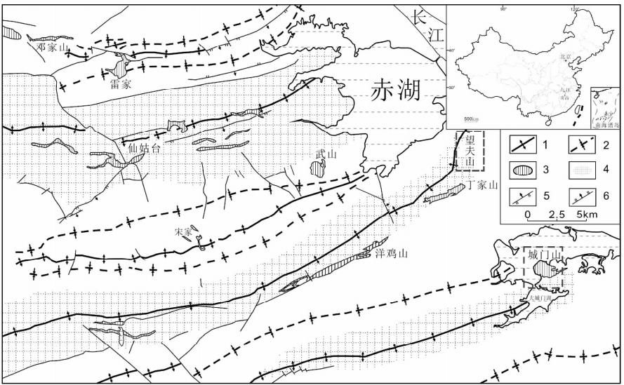 ![]() | 图 1 九瑞地区地质纲要图(据江西省地质矿产局赣西北大队, 2010①改编) 1-向斜轴;2 -背斜轴;3-岩体;4-志留纪地层分布;5-逆断层;6-正断层.黑色虚线矩形框区域为两个研究区:城门山与望夫山 Fig.1 Geological sketch map of the Jiurui district |