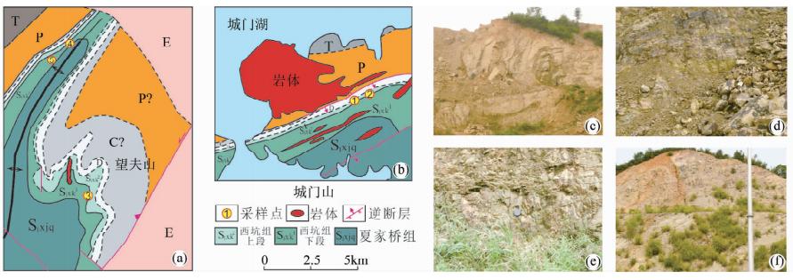 ![]() | 图 2 城门山、望夫山采样地点地质简图及野外露头照片 (a)-望夫山采样地点及地质简图;(b)-城门山采样地点及地质简图.点1为实测剖面的位置,点2为城门山实测剖面北东东300m位置的另一处西坑组地层剖面,可见复理石建造;点3、点4、点5为望夫山化石采集点分别对应样品编号WFS110718-03、WFS110718-05和WFS110719-05;(c)点4野外露头照片;(d)点5野外露头照片;(e)点3野外露头照片;(f)点2野外露头照片 Fig.2 Geological sketch map and sample locations of Chengmenshan and Wangfushan |