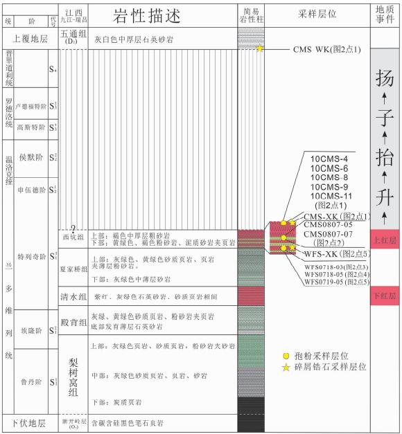 本次研究的地层为矿集区五通组下部,志留纪顶部的地层(图 2)。李敏尧于1933年将位于武宁与瑞昌间的这套下部为230m厚的黄绿色粉砂岩、泥质砂岩夹页岩,上部为厚约80m的褐色粗砂岩称为“阳扶尖砂岩”,时代定位泥盆纪-石炭纪,但是没有化石证据。之后盛莘夫于1942年将其时代改为志留纪,也没有化石证据。江西省区域地质调查队于1964年将这套地层改名为“西坑组”,认为其时代为晚志留世,但是也没有化石证据。1976年该地质队在江西修水县的 西坑组发现了无颌类鱼类化石,根据化石对比,认为地层时代为早泥盆世。 潘江和王士涛(1983)在该地区西坑组底部发现了多鳃鱼目化石,并发现西坑组的无颌类鱼类化石可以和茅山砂岩中的对比。江西省地质矿产局(1984)考虑到本区域西坑组的层位与西南地区晚志留世的“上红层”可对比,将时代又改归为晚志留世。邵卫根和万红(1992a)在开展1?5万范家铺幅区域地质调查时,在西坑组发现了一批窄鳞鱼类化石,并根据化石时代将西坑组的时代定位为晚志留世-早泥盆世中晚期。江西省地质矿产厅(1997)认为“西坑组”相当于“阳扶尖砂岩”,且赞成邵卫根等人的研究成果,并将该套志留纪顶部的岩石定名为“茅山组”,时代为晚志留世-早泥盆世。林宝玉(1998)称江西北部的这套地层为“西坑组”,其时代为早志留世。同时质疑武宁、瑞昌附近的这套“阳扶尖砂岩”能否称为“西坑组”,还有待于继续研究。随着对志留系“上红层”(如廻星哨组),或称为“二红层”(耿良玉等,1999)研究的深入,部分观点认为“上红层”的时代应归于兰多维列统特列奇阶晚期(王成源, 1998;耿良玉等,1999;王怿等,2011;戎嘉余等, 2012),且“上红层”的底界在不同地区是不同的,顶界也不同,都是穿时的(戎嘉余和陈旭, 1990; 戎嘉余等,1990;王成源,2011)。西坑组也被归于“上红层”,在时代上可以与其他“上红层”的地层时代进行对比,故也将西坑组的时代定为兰多维列统特列奇晚期。