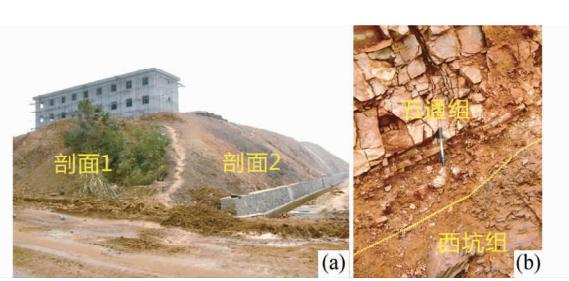 ![]() | 图 4 城门山实测剖面野外露头 (a)-两个剖面相互关系示意图;(b)-五通组与前泥盆纪地层不整合接触界限,图中黄线即为两组地层的分界线 Fig.4 The field outcrop of measured section at Chengmenshan |