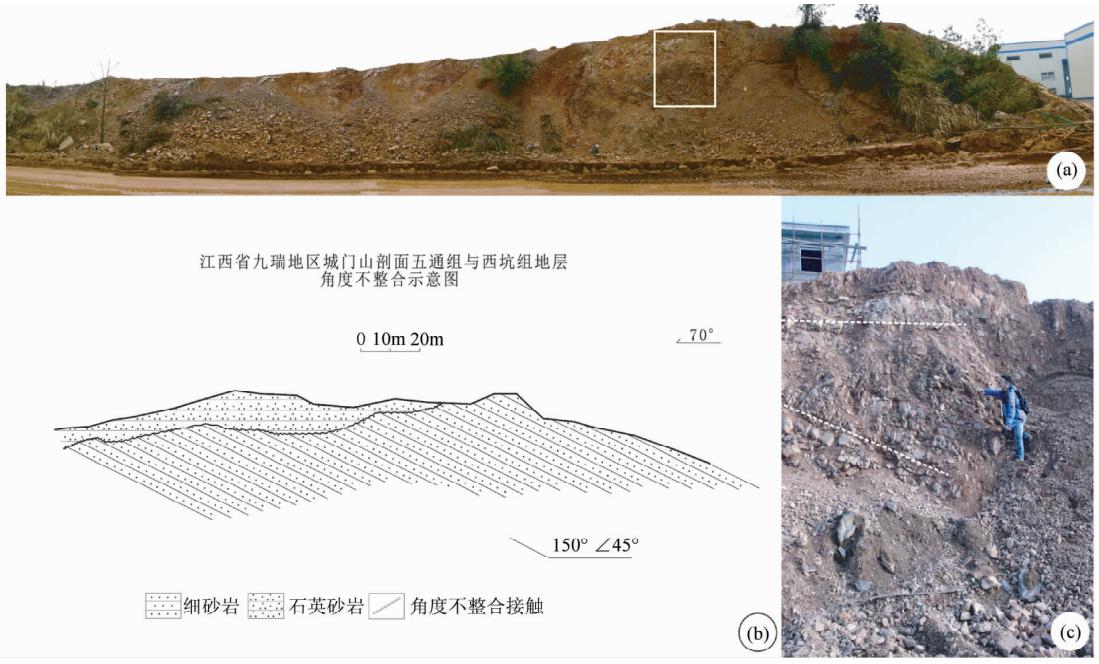 结合剖面1和剖面2 的野外实地观测情况,我们可以得出这样一个结论:城门山地区五通组和西坑组地层之间,存在一个较明显的角度不整合。而在九瑞矿集区的其他地方,西坑组与上覆地层五通组的接触关系为微角度不整合或者平行不整合。