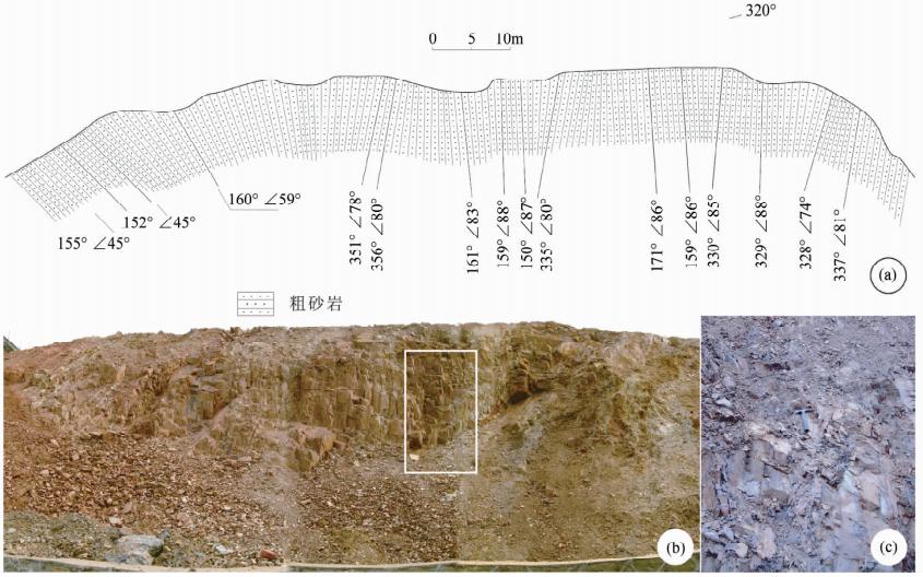 ![]() | 图 5 剖面1实测情况 (a)-剖面1全景拼合图;(b)-根据剖面1实测数据绘制的剖面示意图;(c)-图a 所选区域放大,白色虚线表示地层产状方向 Fig.5 The field outcrop and geological cross section of measured section 1 at Chengmenshan |