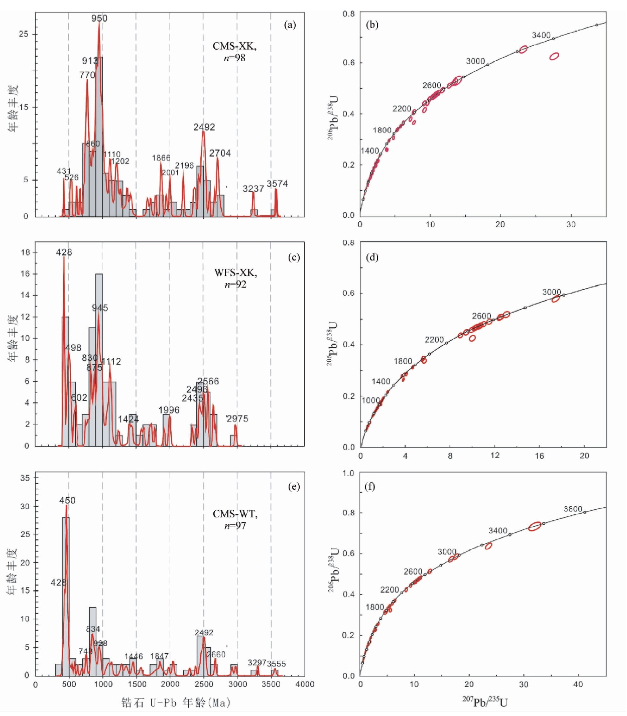 ![]() | 图 8 碎屑锆石年龄谱图与协和图 Fig.8 Diagrams of relative U-Pb age probability and U-Pb concordia for detrital zircons |