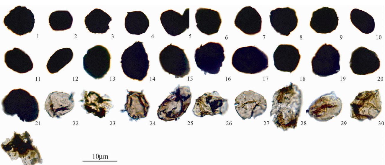 1-21,26-30.光面球藻(未定多种)Leiosphaeridia sp. 1,2, 3.样品号:10CMS-4;4, 5, 6, 7.样品号:10 CMS -6;8, 9.样品号:10 CMS-8;10.样品号:10 CMS-9;11, 12.样品号:10 CMS-11;13, 14, 15.样品号:CM50807-09-01;16, 17, 18.样品号:CMS 080709-02;19, 20, 21.样品号:CMS 0807-07-01. ;26, 27.样品号:WFS2011-07-18-03;28, 29, 30.样品号:UFS2011-07-18-05 22.瘤面球藻(未定种)Loplm.sphaeridium sp.样品号:UFS201107-19-O5 23.多叉藻(未定种)Multiplicisphaeridium sp.样品号:UFS2011-07-19-O5 24-25.日射藻(未定种)Salisphaeridium sp.样品号:UFS2011-07-19-05 31.拟昆布膜片(未定种)Lamiuarites sp.样品号:CMS 0807-07-01 其中1-18号为城门山实测剖面的样品;19-21 ,31号为城门山复理石建造剖面的样品;22-30号为望夫山野外露头样品 |