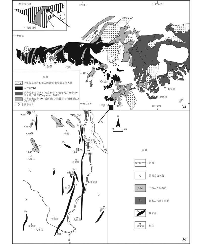 1 区域地质背景及矿区地质冀东地区隶属华北克拉通东部陆块(Zhao et al., 1998; Zhao and Cawood, 2012)(图 1)。华北克拉通是世界上最古老的克拉通之一,也是我国最大最古老的前寒武纪克拉通。它的北面与中亚造山带相邻(Xiao et al., 2003),南面紧邻古生代-三叠纪的秦岭-大别-苏鲁造山带(Li et al., 1993; Meng et al., 2000; Li et al., 2007)。华北克拉通的基底主要由太古宙TTG、麻粒岩和少量变质火山岩组成,其上部被古元古代、寒武纪-奥陶纪灰岩、石炭纪-二叠纪碎屑岩以及中生代的盆地沉积物及火山岩所覆盖(Zhao and Cawood, 2012)。