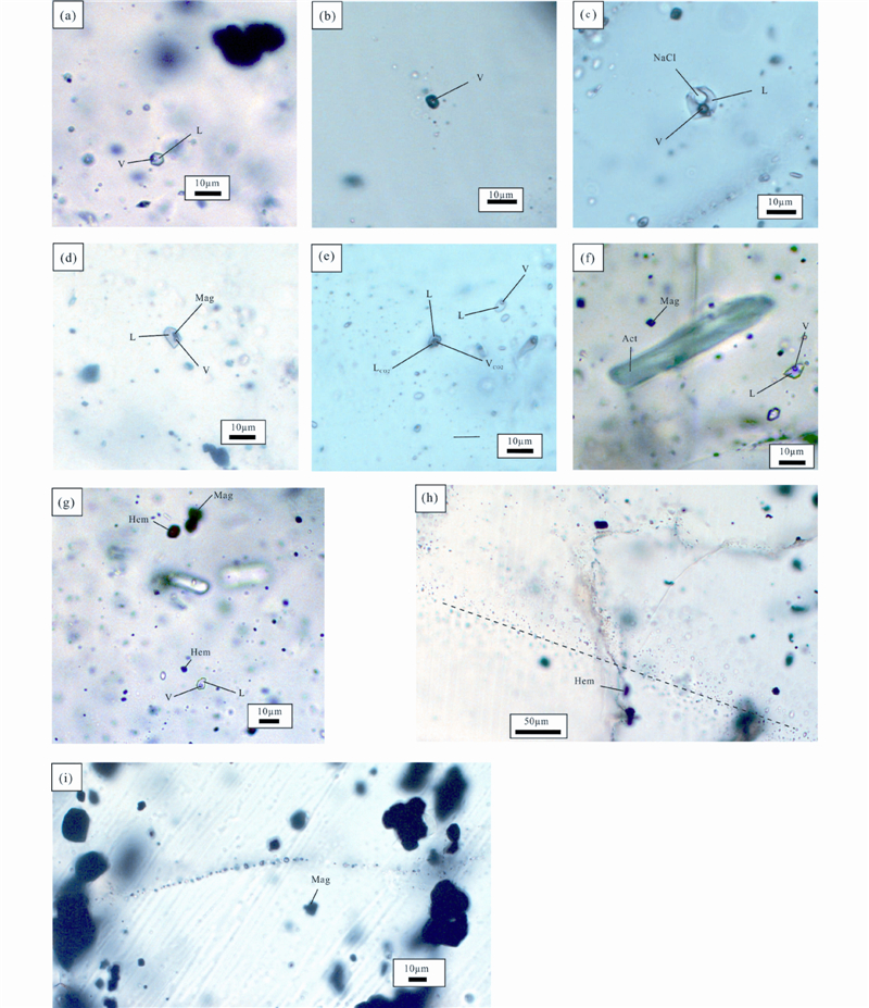 ![]() | 图 4 司家营BIF流体包裹体显微特征 (a)-呈孤立分布的Ⅲ类负晶形包裹体;(b)-呈孤立分布的Ⅲ类富气相包裹体;(c)-Ⅳ类包裹体,子矿物可能为石盐;(d)-Ⅳ类包裹体,子矿物可能为磁铁矿;(e)-Ⅴ类含液相CO2三相包裹体;(f)-与阳起石共生的Ⅲ类包裹体;(g)-和赤铁矿共生的液体包裹体;(h)-和赤铁矿共生的Ⅰ类包裹体;(i)-Ⅱ类包裹体.矿物代号:NaCl-石盐;Mag-磁铁矿;Act-阳起石;Hem-赤铁矿 Fig. 4 Micro-photographs of fluid inclusions in the Sijiaying BIF (a)-isolated Ⅲ-type negative crystal fluid inclusions;(b)-isolated Ⅲ-type rich gas fluid inclusions;(c)-daughter mineral-bearing(Ⅳ-type)inclusion and the daughter mineral may be halite;(d)-daughter mineral-bearing(Ⅳ-type)inclusion and the daughter mineral may be magnetite;(e)-CO2-bearing three-phase(Ⅴ-type)inclusions;(f)-Ⅲ-type fluid inclusions coexist with actinolite;(g)-liquid fluid inclusions coexist with hematite;(h)-Ⅰ-type fluid inclusions coexist with hematite;(i)-Ⅱ-type fluid inclusions. Mineral abbr.: NaCl-halite; Mag-magnetite; Act-actinolite; Hem-hematite |