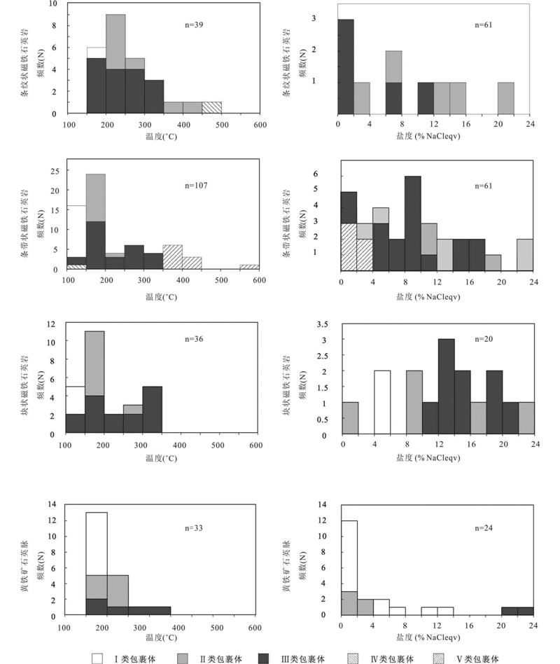 绿帘-角闪岩相变质期、韧性剪切和热液蚀变期以及抬升氧化期形成不同种类的流体包裹体(表 2),其中既有原生包裹体,也有次生和假次生包裹体,形态多样,长轴多介于5~10μm,少数包裹体的长轴介于3~5μm或者10~20μm,主要可划分为以下5类:①次生包裹体(Ⅰ类):主要为气液两相包裹体和少量液体包裹体。气液两相包裹体充填度介于5%~15%,多为椭圆形、长条形、长方形和不规则形,多呈成群和线性分布。条带状阳起磁铁石英岩和黄铁矿石英脉中均存在大量这类包裹体,完全均一至液态。冰点温度和初熔温度表明其属NaCl-H2O体系(图 4h);②假次生包裹体(Ⅱ类),主要为气液两相包裹体(L+V),充填度介于5%~10%。室温下主要由液相和气泡组成,在石英颗粒内部呈线性分布。冰点温度表明其属NaCl-H2O体系(图 4i);③原生包裹体(Ⅲ类),主要为气液两相包裹体,少量富气相包裹体。多为负晶形、四边形、长条形和椭圆形,大多在富铁和富硅条带的石英中呈孤立分布。冰点温度表明其属于NaCl-H2O体系。四类矿石中均含有该类型包裹体,其中又以条纹状阳起磁铁石英岩石英-1含量最高(图 4a,f);④含子矿物包裹体(L+V+S)(Ⅳ类),室温下主要由液相、气相和子矿物组成,该类型包裹体极少。子矿物可分为两种,一种为无色透明的正方体或略带浑圆形,推测可能为石盐(图 4c)。另一种为黑色,不透明,长方体,反射色为钢灰色,推测其为磁铁矿(图 4d);⑤含CO2三相包裹体(Ⅴ类),室温下由液相水、液相CO2和气相CO2组成。大多为孤立分布,其余分布 于线性排列的次生和假次生包裹体附近(图 4e)。条带状阳起磁铁石英岩含有较多、块状磁铁石英岩中含有极少量该类型包裹体。