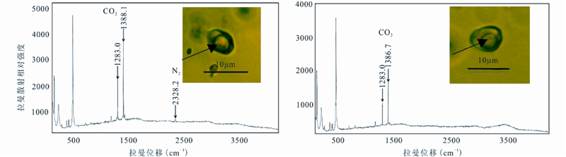司家营BIF矿石中大部分气液两相流体包裹体的气液比较低(5%~8%),在进行激光拉曼分析时由于气泡运动强烈导致无法准确测量,我们选择气液比较高的Ⅴ类含CO2包裹体(30%~40%)进行气体成分测定,结果显示(图 6),大部分Ⅴ类包裹体气相成分为CO2和N2,此外还有少量纯CO2的包裹体。