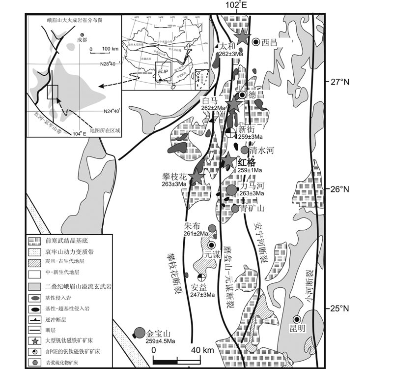 峨眉山大火成岩省位于扬子板块西部至青藏高原东缘的广大地区,并一直延伸至越南北部,出露面积超过5×105km2(图 1)。它主要由峨眉山玄武岩、镁铁-超镁铁质层状侵入体以及同源的酸性、碱性侵入岩组成,一般认为是二叠纪峨眉山地幔柱作用的产物(Chung and Jahn, 1995; Song et al., 2001; Xu et al., 2001; 宋谢炎等,2001; Zhou et al., 2002; Zhang et al., 2006,2008,2009,2014)。攀西地区位于峨眉山大火成岩省的内带,沿南北向磨盘山-元谋断裂和攀枝花断裂带出露一系列含V-Ti磁铁矿矿床的基性-超基性层状岩体,从北向南依次为太和岩体(262±3Ma,Zhou et al., 2008)、白马岩体(262±3Ma,Guo et al., 2004)、新街岩体(259±3Ma,Zhou et al., 2002)、红格岩体(259±1.3Ma,Zhong and Zhu, 2006)和攀枝花岩体(263±3Ma,Zhou et al., 2005; 259.8±0.8Ma,Hou et al., 2012; 261.4±4.6Ma,Hou et al., 2013)(图 1)。根据岩石组合的不同,这些含矿岩体可以分为两类:(1)镁铁-超镁铁质侵入体,如红格、新街岩体;(2)镁铁质侵入体,如攀枝花、太和、白马岩体。红格岩体是攀西地区最大的赋存V-Ti磁铁矿矿床的层状岩体(攀西地质大队,1984①)。