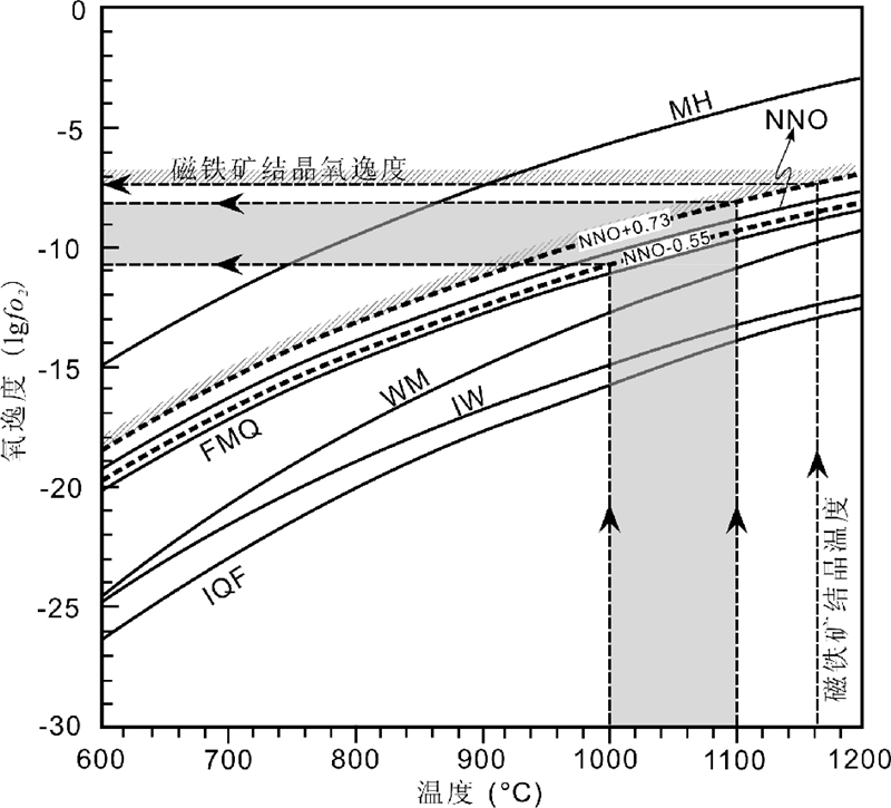 如图 9所示,红格岩体三个岩相带金云母在Fe3+-Fe2+-Mg图解中投点均位于NNO(镍-氧化镍)缓冲剂附近并与其平行(Wones and Eugster, 1965),说明红格岩体金云母结晶时的氧逸度为NNO(~FMQ+0.7),与公式(2)计算得出的角闪石氧逸度相吻合。而根据角闪石成分计算得出其形成温度为1000~1100℃(见上文),即其对应的氧逸度绝对值(lgfO2)在-10.8到-8之间(图 10)。红格岩体角闪石和金云母都属于晶间矿物,其结晶温度低于磁铁矿的结晶温度(~1165℃,Luan et al., 2014),而且其结晶时的氧逸度也是低于磁铁矿的。所以,推测红格岩体磁铁矿结晶时的氧逸度高于NNO+0.73(FMQ+1.43),在1165℃时的绝对氧逸度也大于-7.3(图 10)。