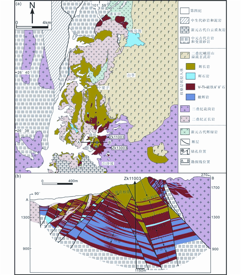 ![]() | 图 2 红格层状岩体地质简图(a)和勘探线剖面图(b)(据四川106地质队,2010①修改) Fig. 2 Simplified geological map(a) and cross section of the exploration line(b)of the Hongge layered intrusion |