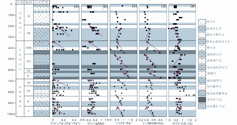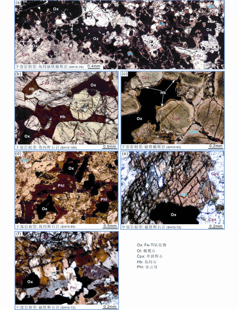 下部岩相带可以分为4个旋回(从下往上依次为I、II、III、IV),每个旋回从下往上伴随着橄榄石的减少,由下部的角闪(磁铁)橄辉岩过渡为上部的角闪(磁铁)辉石岩(表 1)。中部岩相带可以分为4个旋回(从下往上依次为V、VI、VII、VIII),伴随着Fe-Ti氧化物的减少,每个旋回由下部的块状矿石,向上过渡为磁铁橄辉岩、磁铁辉石岩或者(磁铁)辉长岩(表 1)。上部岩相带可以分为2个旋回(IX、X),旋回IX主要为磷灰石磁铁辉长岩,旋回X主要为磷灰石辉长岩,间夹少量磷灰石磁铁辉长岩层(表 1)。