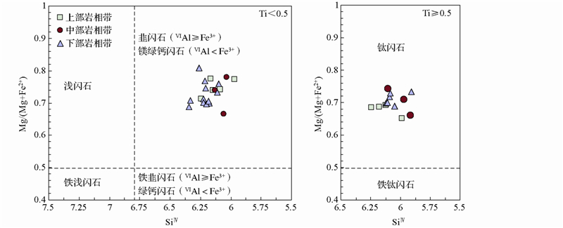 根据角闪石化学分子式(表 2),角闪石阳离子特征为:CaB=1.72~1.9,(Na+K)A=0.66~0.92。按国际矿物学协会角闪石专业委员会提出的命名原则,红格岩体角闪石属于钙角闪石(CaB≥1.5,(Na+K)A≥0.5)。按钙角闪石的进一步分类命名原则,红格岩体角闪石Si=5.91~6.34,Mg/(Mg+Fe2+)=0.65~0.78,投影到Si-Mg/(Mg+Fe2+)图解上定名为韭闪石、镁绿钙闪石和钛闪石(图 4)(Leake et al., 1997)。红格岩体角闪石化学成分显示以下特征:富镁(13.0%~15.0%)、富CaO(11.0%~12.5%)和贫钾、富钠(K2O=0.5%~1.5%,Na2O=2.0%~3.0%)。其TiO2含量主要分布在3.5%~5.0%之间,Al2O3含量主要在10.5%~12.0%之间(表 2)。