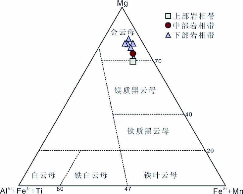 ![]() | 图 5 红格岩体云母Mg-(AlVI+Fe3++Ti)-(Fe2++Mn)分类图解(据Foster,1960) Fig. 5 Mg-(AlVI+Fe3++Ti)-(Fe2++Mn)diagram of the mica in the Hongge intrusion(after Foster,1960) |