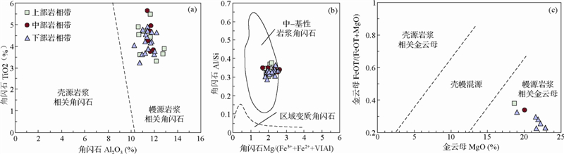 6.1 角闪石和金云母的成因角闪石的嵌晶状结构及其在光学显微镜下显示的均一干涉色均表明红格岩体的角闪石是岩浆成因的,而非后期热液蚀变的产物(Luan et al., 2014)。红格岩体角闪石Al2O3含量为10.5%~12.0%,Si/(Si+Ti+Al)=0.69~0.74,结合钙质角闪石的Al2O3-TiO2分类图解(图 6a)可知,红格岩体角闪石具有幔源岩浆角闪石的特征(Al2O3>10%,Si/(Si+Ti+Al)≤0.765)(姜常义和安三元,1984);其Al/Si比值为0.30~0.37,Mg/(Fe3++Fe2++VIAl)比值为1.69~2.63,具有中-基性岩浆角闪石的特征(Al/Si=0.10~0.67,Mg/(Fe3++Fe2++VIAl)=1.50~2.0),在Al/Si-Mg/(Fe3++Fe2++VIAl)图解上,投影在中-基性岩浆角闪石区域(图 6b)(据薛君治等,1987)。将红格岩体金云母的化学分析结果在MgO-FeOT/(MgO+FeOT)图上投点,主要落在幔源岩浆相关区域(图 6c)(周作侠, 1986,1988),暗示红格岩体金云母的形成也与幔源岩浆作用有关。上述特征都说明红格岩体角闪石和金云母都是与幔源岩浆作用有关的原生矿物。