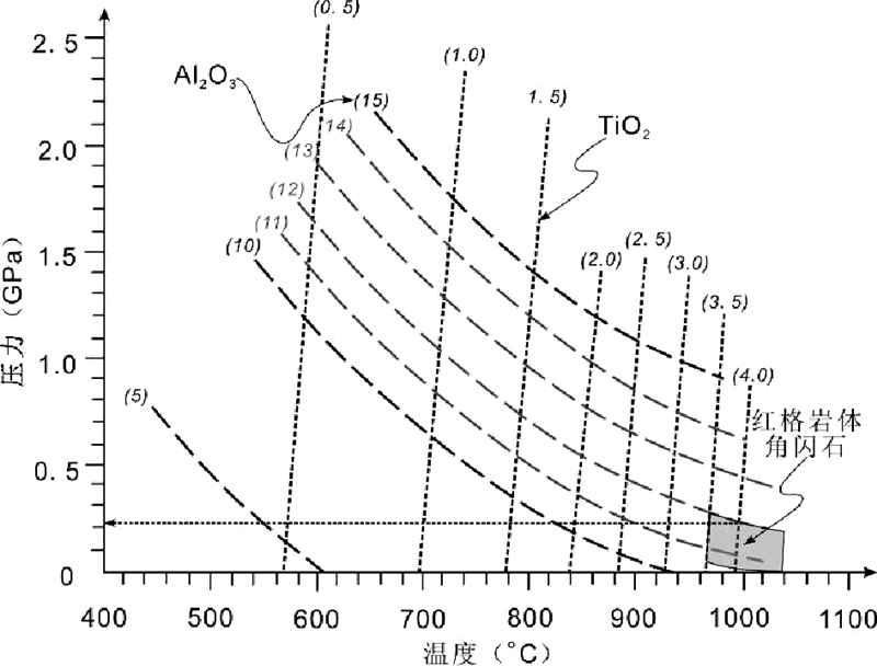 Ernst and Liu(1998)给出了从玄武质岩浆中结晶的角闪石中Al2O3和TiO2含量随温度、压力同时变化的曲线格子,可用于半定量估算角闪石结晶时的温度和压力。红格岩体角闪石Al2O3含量主要分布在10.5%~12.0%,TiO2含量在3.5%~5.0%左右(表 2),通过内插法得出角闪石结晶时温度在960~1040℃之间,而压力小于2.6kbar(图 7)。这种半定量方法估算的角闪石结晶温度明显低于根据公式(1)定量计算的角闪石结晶温度(1000~1100℃),所以其估算的压力也偏大,通过角闪石结晶温度(1000~1100℃)校正后得出其结晶压力小于2.2kbar,暗示红格岩体的侵位深度小于7.3km。