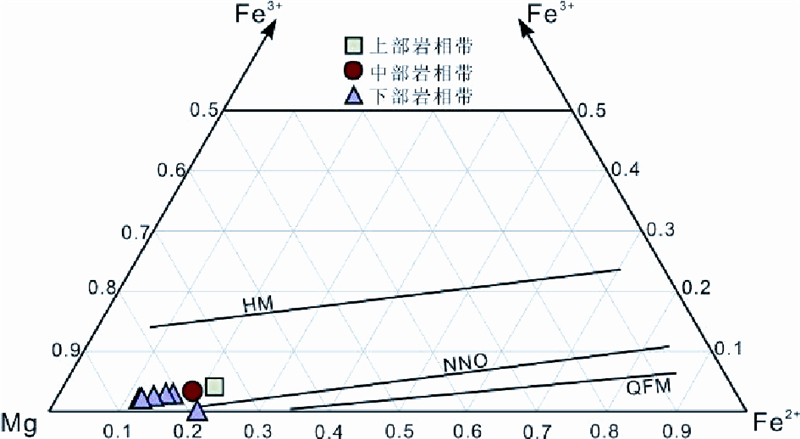 ![]() | 图 9 红格岩体金云母Fe3+-Fe2+-Mg三元图解(据Wones and Eugster, 1965) Fig. 9 Fe3+-Fe2+-Mg ternary diagram of phlogopite in the Hongge intrusion(after Wones and Eugster, 1965) |