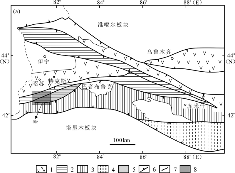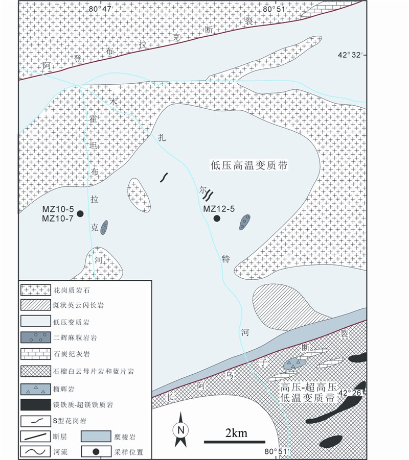 新疆西南天山造山带是中亚南天山造山带的重要组成部分,由塔里木板块向伊犁-中天山板块之下俯冲形成(高俊,1997),是近年来新发现的由洋壳深俯冲形成的高压-超高压变质带,也是洋-陆碰撞之后高压-超高压岩石折返和抬升过程中岩浆活动、深熔作用最为强烈的地区之一,是研究大洋板块俯冲和折返过程中壳-幔循环的理想场所。高压-超高压变质带主要出露于西南天山西部昭苏县境内(图 1),以榴辉岩、蓝片岩、石榴白云母片岩的广泛出露为特征。在这个高压-超高压变质带北侧的木扎尔特河一带,与之平行出露一条低压高温麻粒岩相变质带(李强和张立飞,2004),该低压高温变质带南起长阿吾子断裂,北至阿登布拉克断裂(图 2),出露一套以长英质麻粒岩为代表的典型的高级变质岩,前人曾认为该区域为前寒武纪的结晶基底(王宝喻等,1994;王广瑞,1996),而李强和张立飞(2004)研究认为该区低压高温变质带与其南侧的高压-超高压低温变质带组成了双变质带。