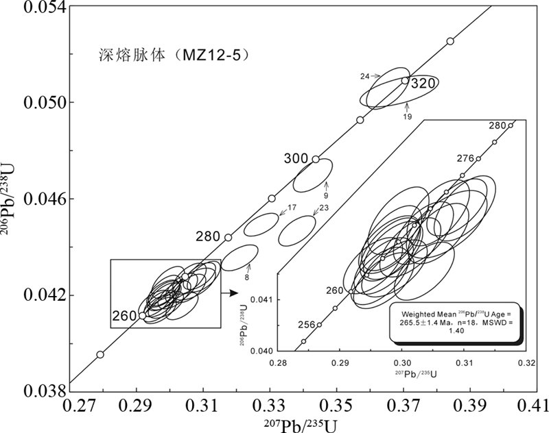 从样品(MZ12-5)的24个不同性质锆石微区进行的U-Pb年龄结果(表 3)来看,锆石记录的年龄较集中(表 3、图 10),锆石记录的206Pb/238U年龄变化于318~261Ma之间,相应的Th/U比值变化于0.043~0.105之间,年龄多数集中变化于270~261Ma,加权平均年龄为265.5±1.5Ma(MSWD=1.4,n=18),相应的Th/U比值较小,变化于0.043~0.066之间,具有深熔锆石的特点,代表了深熔事件发生的年龄。