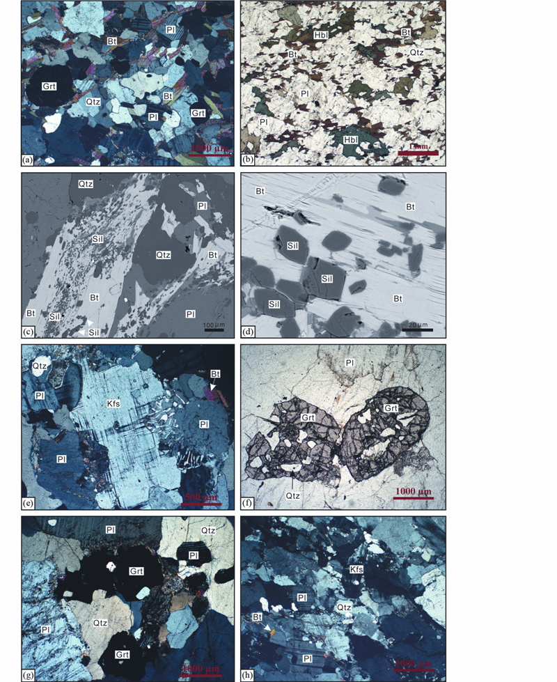 (a)-夕线石榴黑云斜长片麻岩;(b)-角闪黑云斜长片麻岩;(c)-夕线石榴黑云斜长片麻岩的背散射图片;(d)-夕线石榴黑云斜长片麻岩中黑云母发生脱水反应形成大量粒状夕线石;(e)-长英质脉体MZ10-5中的蠕英石;(f、g)-含石榴石长英质脉体MZ10-7;(h)-长英质脉体MZ12-5.矿物代号:Grt-石榴石;Pl-斜长石;Kfs-钾长石;Bt-黑云母;Sil-夕线石;Qtz-石英;Hbl-普通角闪石