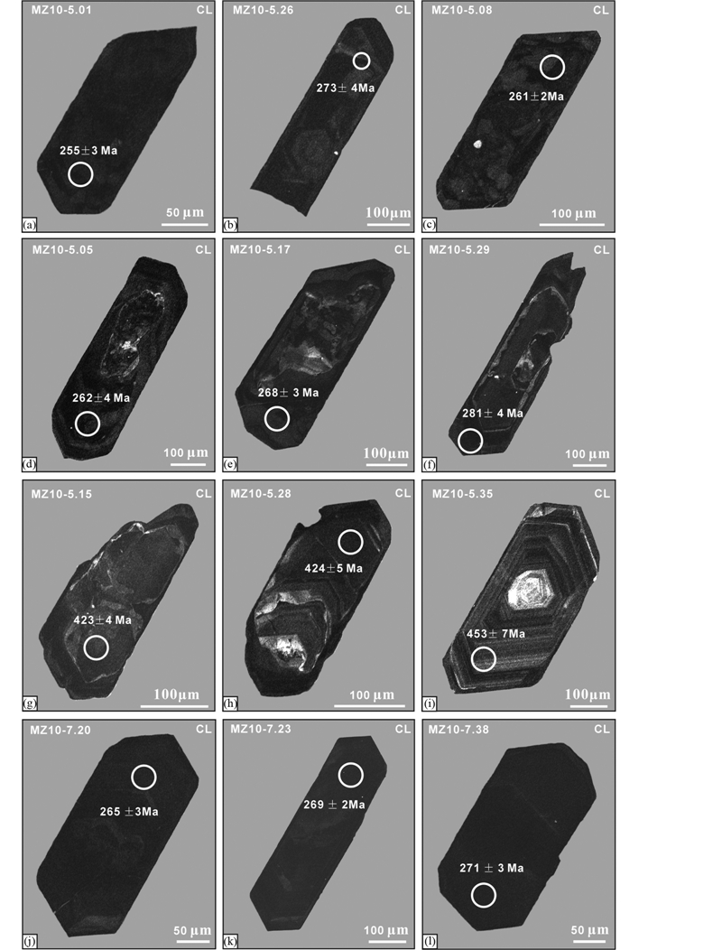 长英质脉体(MZ10-5)锆石长柱状,自形晶,棱角清晰。根据锆石的阴极发光图像特征,可将锆石可划分为三种类型,第一种类型的锆石内部均匀(图 5a,b),具有弱发光效应(灰色-灰黑色),少量锆石颗粒具有斑杂状构造(图 5c);第二种类型的锆石阴极发光图像显示明显的双层结构(图 5d-h),具有相对强发光效应的继承性核(灰色-灰白色)和弱发光效 应的边(灰黑色),继承性核的形态不规则,呈浑圆状、港湾状等,溶蚀结构明显,多数继承性核呈斑杂状(图 5d-g),少数则具有弱的岩浆结晶环带(图 5h),而边部则具有典型深熔锆石的特点,发光较均匀;第三种类型的锆石具有强发光效应(白色-灰白色)继承性的核和弱发光效应(灰黑色)的边,锆石边部具有典型的密集岩浆结晶环带(图 5i)。