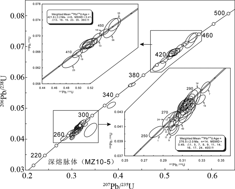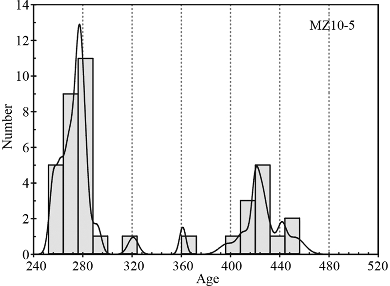 从样品(MZ10-5)的39个不同性质锆石微区进行的U-Pb年龄结果(表 1)来看,锆石记录的年龄可划分为2组(表 1、图 7),第一组14个继承性核部锆石微区记录的206Pb/238U年龄变化于453~321Ma之间,集中变化于426~419Ma,相应的Th/U比值变化于0.112~0.282之间,记录的206Pb/238U加权年龄为421.8±3.2Ma(MSWD=0.41,n=6)(图 7),这组年龄数据点在谐和图上相对集中分布,可信度高,代表锆石的结晶年龄,在误差范围内与寄主岩石夕线石榴黑云斜长片麻岩和石榴黑云斜长片麻岩一组集中分布的约420Ma继承性碎屑锆石年龄完全一致(待发表),表明研究区长英质脉体可能是寄主岩石片麻岩部分熔融结晶的产物。第二组25个锆石变质增生边记录的206Pb/238U年龄十分相似,变化于292~255Ma之间,集中变化于281~271Ma之间,加权平均年龄为276.5±2.0Ma(MSWD=0.49,n=14)(图 7),相应的Th/U比值较小,变化于0.044~0.085之间,均小于0.1,具有深熔锆石的特点,代表了长英质脉体的形成时间,即深熔事件发生的年龄,表明寄主岩石片麻岩发生部分熔融的时间为早二叠世。在锆石206Pb/238U年龄分布图(图 8)上,样品也显示明显的继承性岩浆结晶年龄和深熔年龄两组。