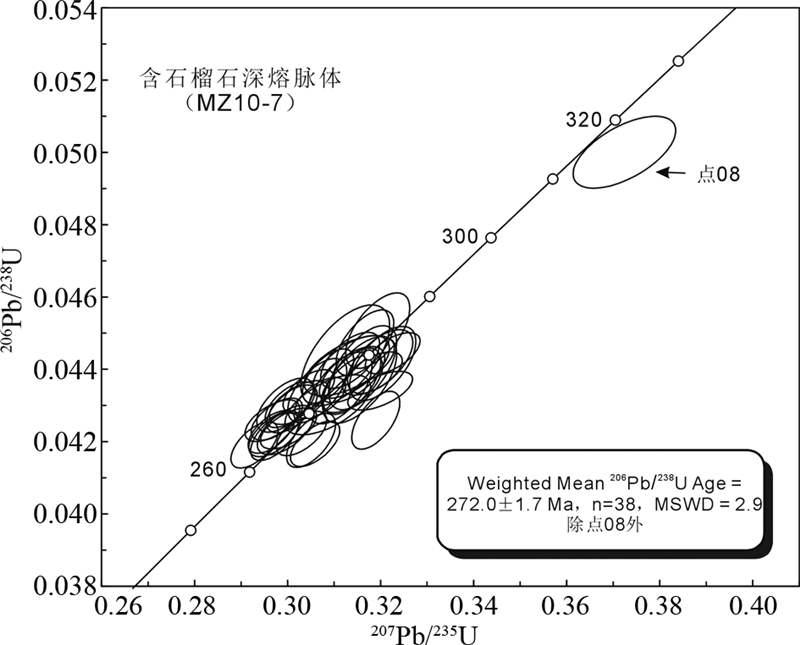 从样品(MZ10-7)的39个不同性质锆石微区进行的U-Pb年龄结果(表 2)来看,锆石记录的年龄除一个年龄315Ma较大外(图 9),其余38个锆石记录的206Pb/238U年龄集中变化于284~265Ma之间,加权平均年龄为272.0±1.7Ma(MSWD=2.9,n=38),相应的Th/U比值除个别点大于0.1外,其它比值较小,变化于0.029~0.081之间,为典型的深熔锆石,代表了深熔事件发生的年龄。