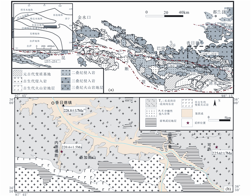 ![]() | 图 1 东昆仑造山带东段大地构造位置及地质简图(a)和香日德地区地质简图(b) 年龄数据来自:(1)本次研究;(2)Zhang et al., 2010;(3)Xiong et al., 2012;(4)孙雨等,2009;(5) 殷鸿福等,2000①;(6)Chen et al., 2012;年龄单位:Ma Fig. 1 The tectonic location and simplified geological map of eastern part of the East Kunlun Orogen(a) and simplified geological map of the Xiangride area intrusive rocks(b) |