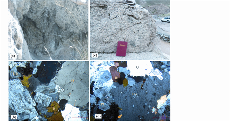 ![]() | 图 2 香日德晚三叠世花岗闪长岩-二长花岗岩野外露头(a、c)及显微镜(b、d)照片 (a)-P3-T2花岗岩闪长岩(富集MME包体);(b)-T3二长花岗岩;(c)-花岗岩闪长岩;(d)-二长花岗岩.Q-石英;Bi-黑云母;Pl-斜长石;Kfs-钾长石 Fig. 2 Outcrop photos(a,c) and photomicrographs of the typical textures(b,d)of the Xiangride area intrusive rocks |