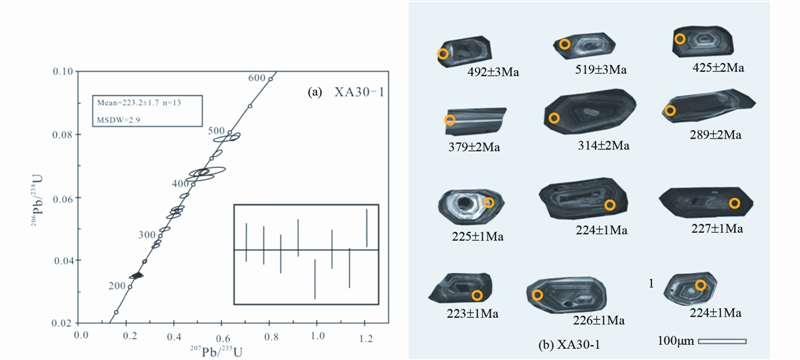 ![]() | 图 3 二长花岗岩(XA30-1)典型锆石CL图像和锆石U-Pb谐和图 Fig. 3 Zircon CL images and U-Pb concordia diagram for monzonitic granite(XA30-1) |